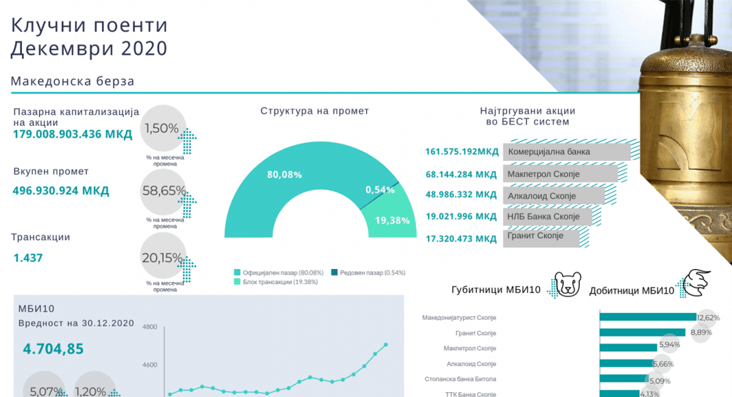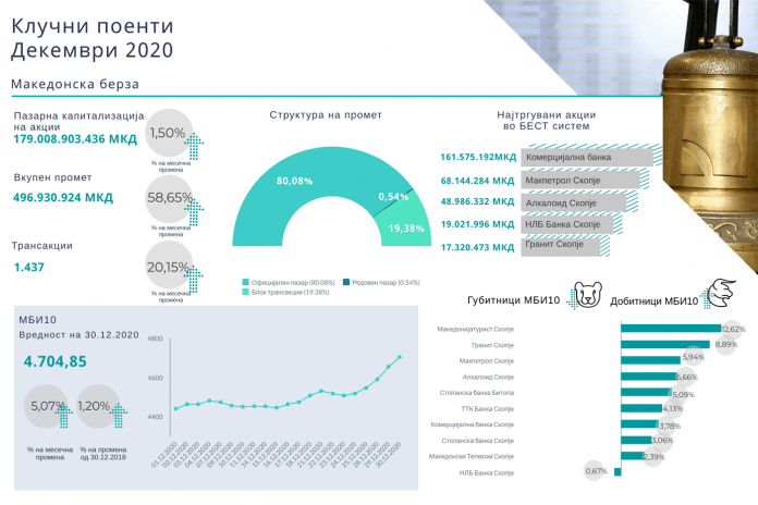 Според податоците кои ги објави Македонскта берза за периодот 01.12 – 31.12.2020 година вкупниот промет изнесувал 496.930.924 денари што претставува зголемување за 58,65 отсто во однос на претходниот месец.