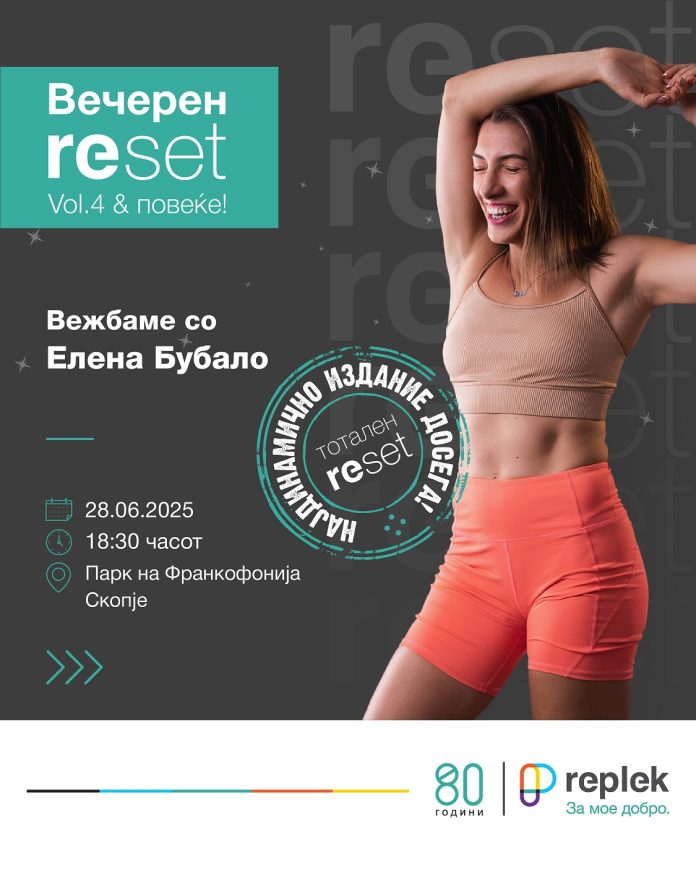 Под мотото „За мое добро“, а во рамките на „РЕсет“ платформата за ДОБРОСОСТОЈБА, Реплек ja организира досега најголемaтa фитнес сесија на отворено. Сесијата ќе биде под водство на познатата фитнес инструкторка Елена Бубало, а ќе се одржи денес, 28 јуни 2025 (сабота) година, во Паркот на Франкофонијата во Скопје, со почеток од 18:30 часот.