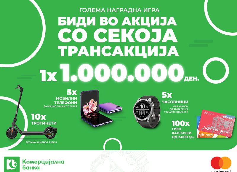 Празничната магија дефинитивно станува волшебна со наградната игра „Биди во акција со секоја трансакција“ на Комерцијална банка затоа што со секоја трансакција со Mastercard или Maestro, извршена со картичка, телефон или смарт часовник, корисникот има поголеми шанси да добие 1.000.000 денари.