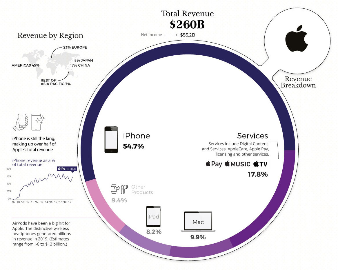 Приходите од iPhone, сè уште се главниот извор на приходи, и тие паднаа за скоро 25 милијарди долари. Сепак, со нето приход од 55,2 милијарди американски долари, Епл ја предводи Биг Тек и во нето приходите и во пазарната капитализација.
