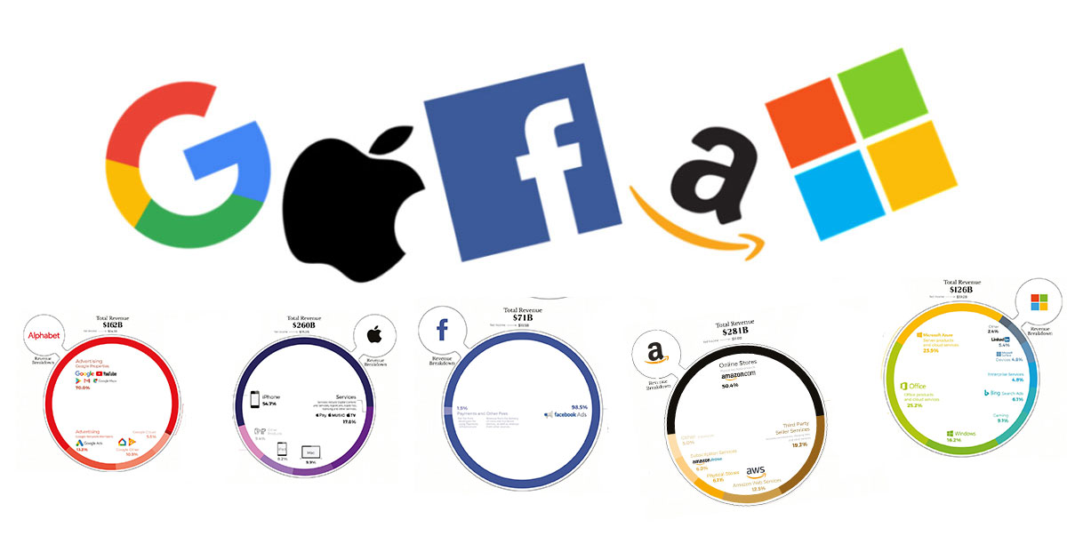И покрај нивните сличности, секоја од петте технолошки компании (Амазон, Епл, Фејсбук, Мајкрософт и Азбука) имаат многу различни текови на пари и траектори на раст. Некои имаат разновидна мешавина на апликации и cloud услуги, производи и акумулација на податоци, додека други имаат поединечен фокус.