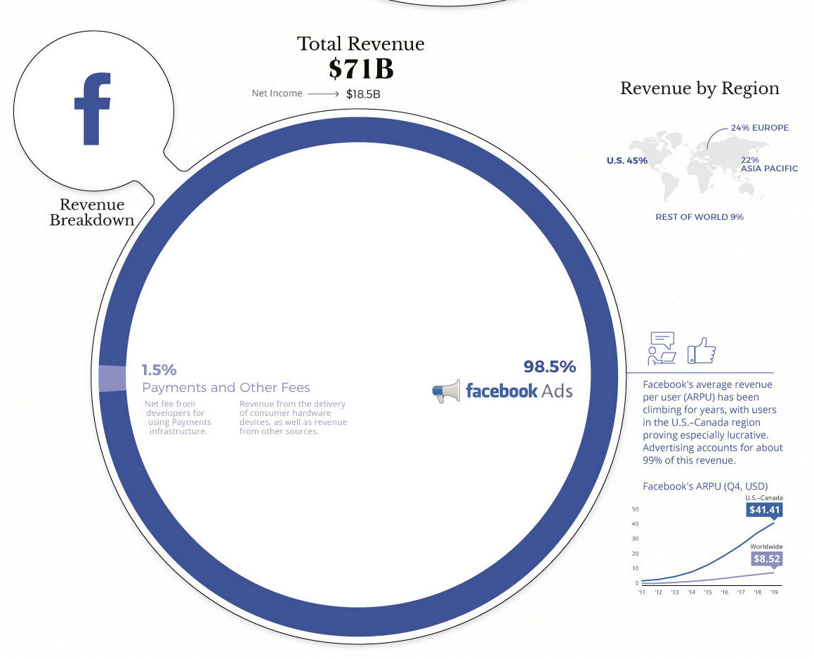 И поголемо усвојување на услуги и интеграција на реклами беа голем поттик за Фејсбук управуван од реклами. Главно поради постојаното зголемување на просечните приходи по корисник, Фејсбук оствари дополнителни 20 милијарди долари приход.