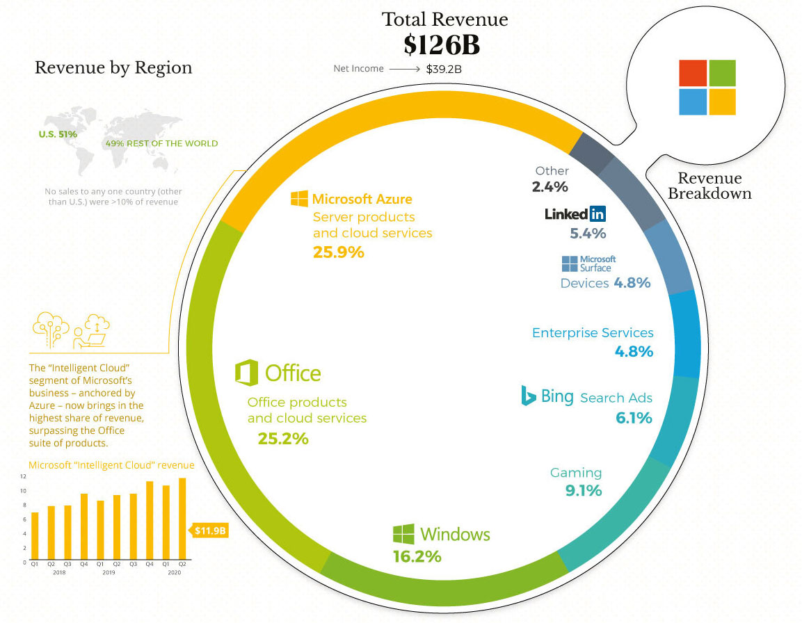 За „Мајкрософт“, растот на cloud компјутерите и услугите доведоа до посилни приходи во скоро сите сегменти. Најинтересно е дека растот на услугите на Azure го надминува оној на Office и Windows, за да стане најголем дел од приходите на компанијата.