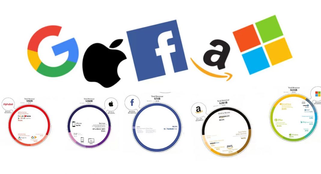 И покрај нивните сличности, секоја од петте технолошки компании (Амазон, Епл, Фејсбук, Мајкрософт и Азбука) имаат многу различни текови на пари и траектори на раст. Некои имаат разновидна мешавина на апликации и cloud услуги, производи и акумулација на податоци, додека други имаат поединечен фокус.