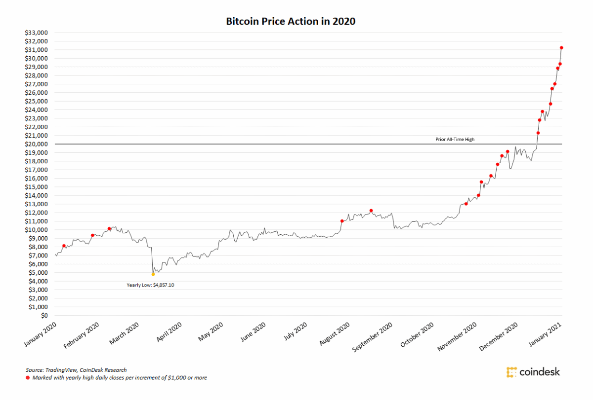 Перформансите доаѓаат после една година во која крипто-валутата се искачи за повеќе од 300% во 2020 година, со скоро 50% добивка само во декември.