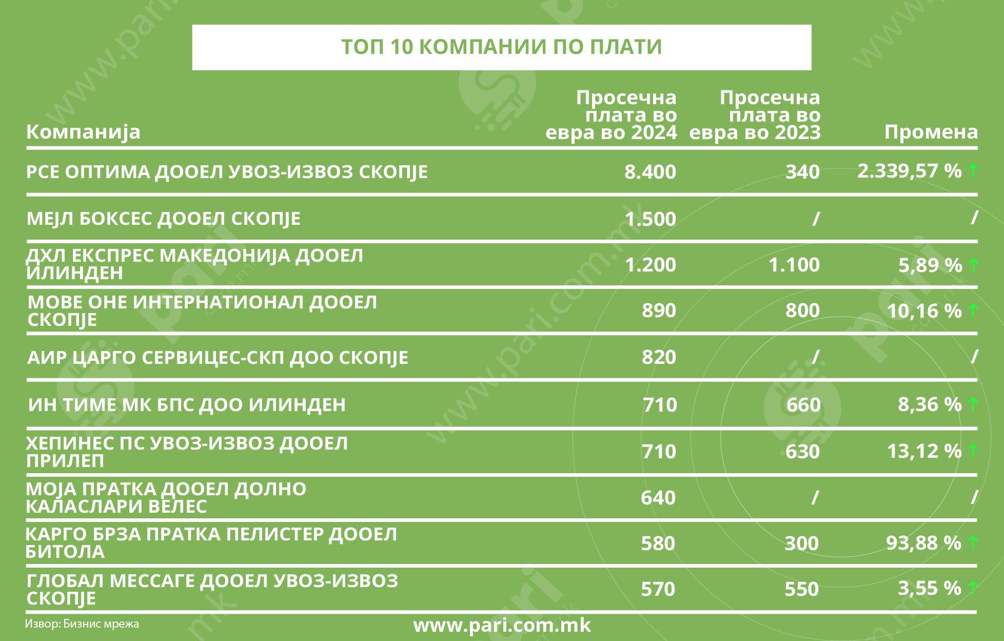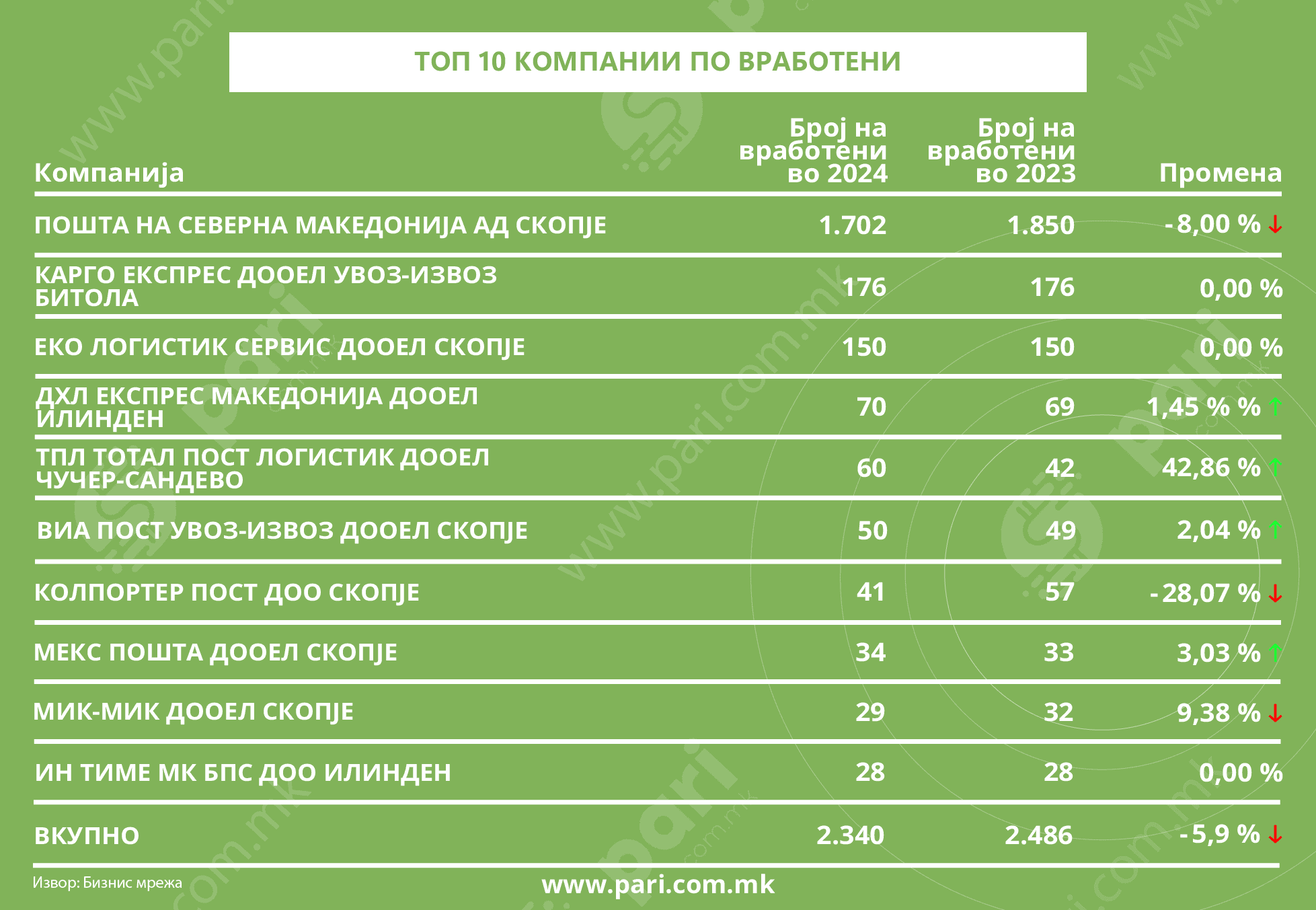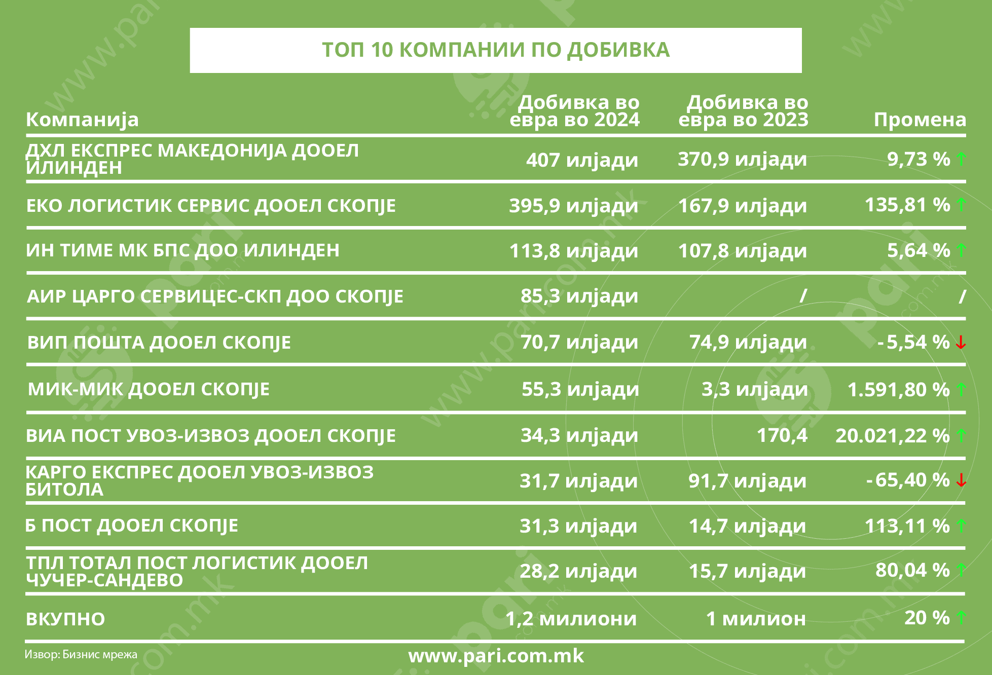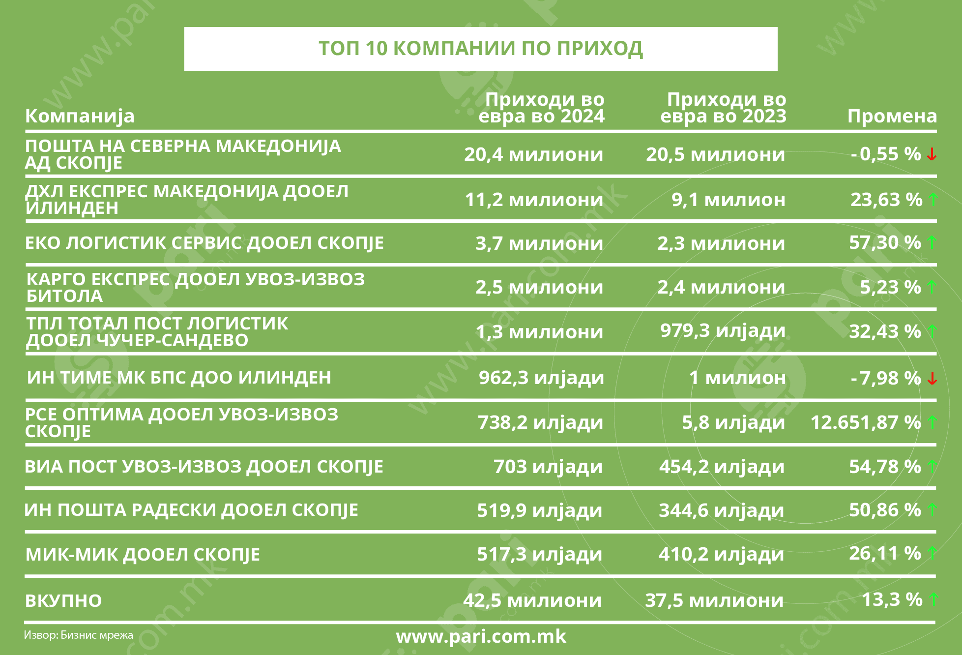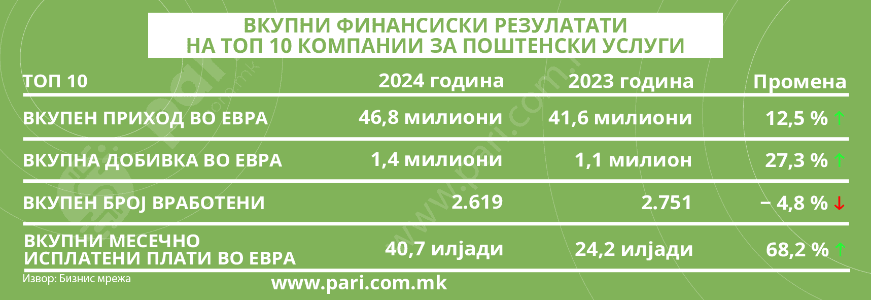 Порталот Пари го анализира пазарот на поштенските услуги во Македонија, на кој дејствуваат стотици фирми. Податоците од Бизнис Мрежа велат: 108 компании лани оствариле вкупен приход од 46,8 милиони евра, што е за 12,5 насто повеќе отколку во 2023 година; добивката изнесува 1,4 милиони евра (+ 27,3 %), а средствата што просечно месечно се двоеле за плата се зголемени за 68,2 насто. И покрај добрите финансиски резултати, бројот на вработени се намалил за 4,8 отсто, односно од 2.751 на 2.619 лица.