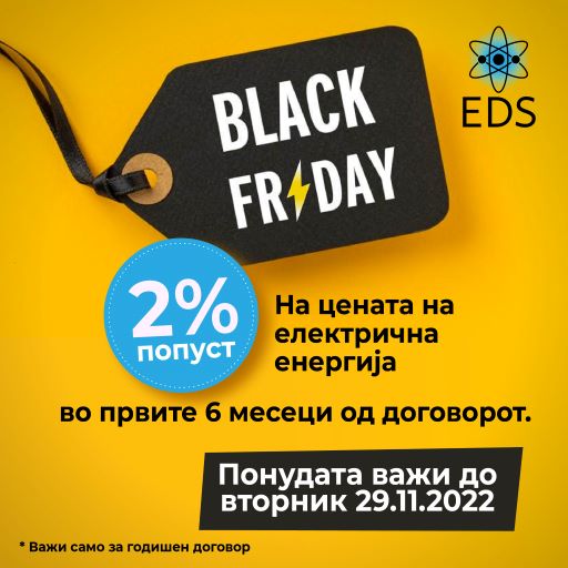 „По повод Black Friday, но пред се’ како општествено одговорна компанија, подготвивме понуда со која што на компаниите им нудиме попуст на трошокот за потрошена електрична енергија. Понудата вклучува попуст од 2 отсто во траење од шест месеци за компаниите кои што ќе потпишат договор со ЕДС АД најдоцна до 29 ноември годинава. Она што е важно, особено во овие кризни времиња во однос на снабдувањето со електрична енергија, е дека ова намалување на трошокот на електрична енергија се однесува на најкритичните месеци од годинава, од јануари до април, кога поради грејната сезона и кризата во снабдување со природен гас цените на струјата можат повторно да постигнат високи нивоа. Имајќи го ова предвид, намалување на цената од 2 отсто во траење од шест месеци ќе значат сериозна заштеда за компаниите“, истакнува главниот извршен директор на ЕДС АД, Јанис Јанопулос.