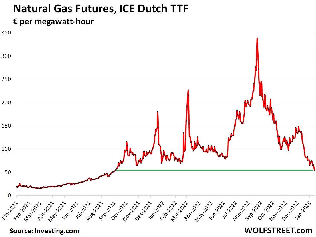 Цената на холандските фјучерси за природен гас TTF пред месец – репер за северозападна Европа, падна за 15% денес на 54,85 евра за мегават-час (MWh) и сега падна за 84% од лудиот скок во летото 2022 година. Цената сега се врати на местото каде што беше во почетокот на септември 2021 година (податоци преку Investing.com):