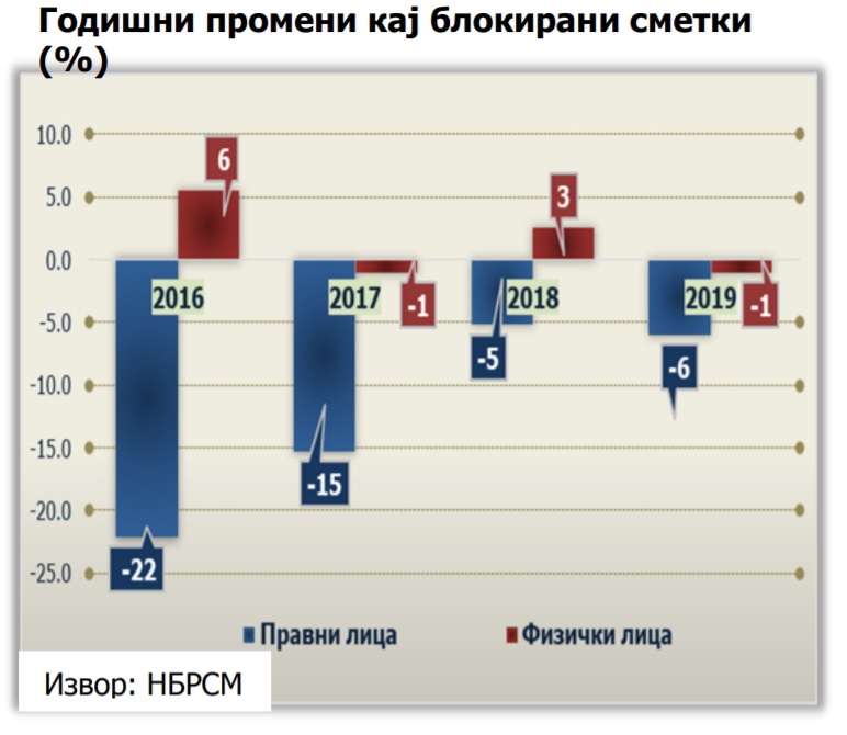 Бројот на блокирани сметки на правни лица (40.600 блокирани сметки во сопственост на 27.600 правни лица) е намален за 5,9 отсто во споредба со изминатата 2018 година