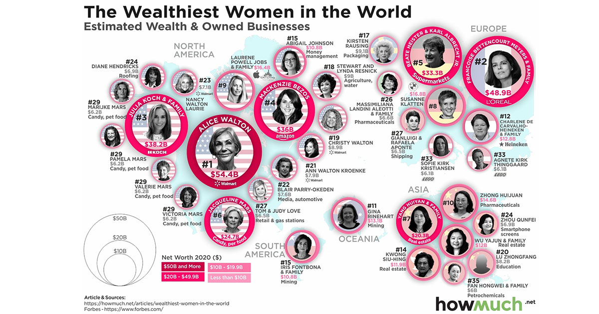 Најбогатата жена на светот е Алис Валтон која е “тешка” 54.4 милијарди долари, согласно листата на 2.095 лица кои се најдоа на списокот на светски милијардери на „Форбс“. Таа е единствената ќерка на основачот на американската мултинационална корпорација за малопродажба „Волмарт“, Сем Валтон. Алис Валтон никогаш активно не учествувала во работата, но наследила акции и дивиденди од компанијата. Таа е голем љубител на уметноста и добар дел од парите што ги има ги троши на скапоцени слики.