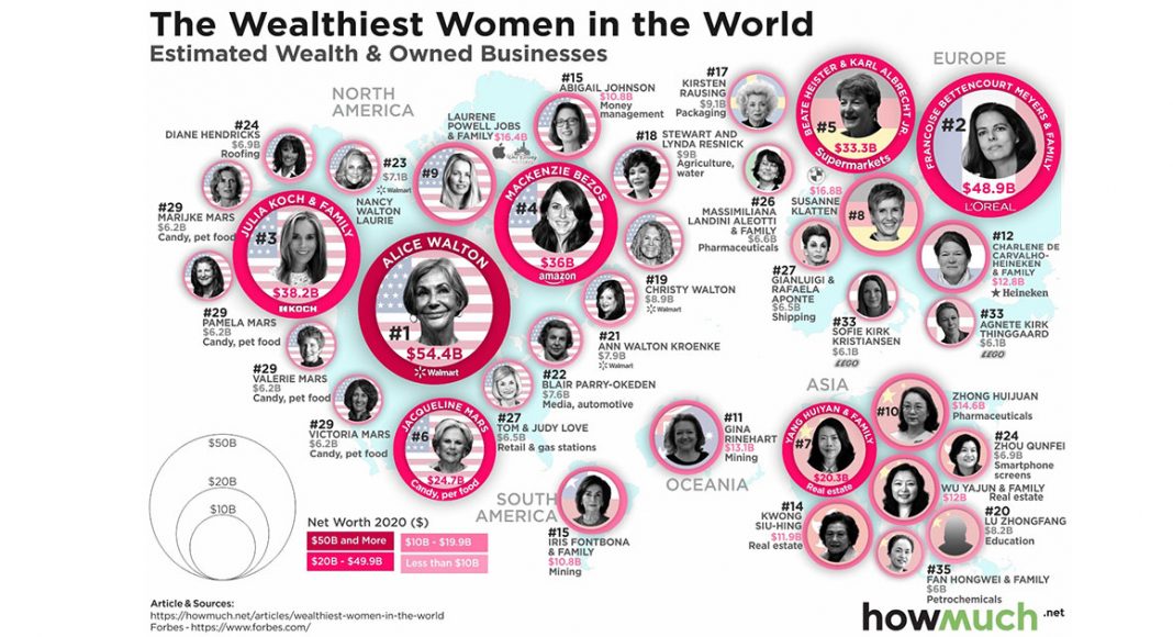 Најбогатата жена на светот е Алис Валтон која е “тешка” 54.4 милијарди долари, согласно листата на 2.095 лица кои се најдоа на списокот на светски милијардери на „Форбс“. Таа е единствената ќерка на основачот на американската мултинационална корпорација за малопродажба „Волмарт“, Сем Валтон. Алис Валтон никогаш активно не учествувала во работата, но наследила акции и дивиденди од компанијата. Таа е голем љубител на уметноста и добар дел од парите што ги има ги троши на скапоцени слики.