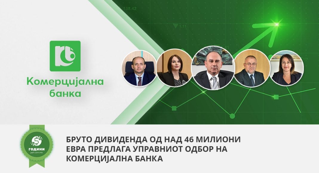 „Врз основа на финансискиот резултат утврден за 2024 година и Програмата на мерки и активности на деловната политика и финансискиот план на Комерцијална банка АД Скопје за 2025 година, усвоена на 30.01.2025 година од страна на Надзорниот одбор на Банката, Управниот одбор на Банката планира до Надзорниот одбор на Банката, а соодветно и до Собранието на акционери, да достави Предлог Одлука за распоредување на добивката со која ќе се исплати бруто-дивиденда во вкупен износ од 2.848.834 илјади денари, како и Предлог Одлука за определување на износот на дивиденда за 2024 година со која за 1 (една) обична акција ќе се предложи бруто-износ од 1.250,00 денари. Предложениот бруто износ од 1.250,00 денари за 2024 година е за 37,4 % повисок во однос на дивидендата за 2023 година“, пишува во објавата од Комерцијална банка.