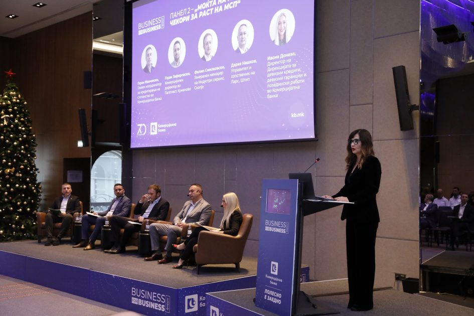 На вториот панел, Горан Ивановски и Ивона Донева од Комерцијална банка со своите гости, Горан Зафировски од Палпласт, Дарко Нашков од Ларс и Филип Смилковски од Индустри сервис, понудија вредни перспективи, практични совети и вистински примери за тоа како банката може да биде клучен партнер во приказната за успех на еден мал или среден бизнис. Оваа динамична дискусија ги опфати предизвиците на извозот и увозот, финансиските инструменти во надворешната трговија кои им помагаат на компаниите при зголемени ризици и потреба од стабилен паричен тек, како и богатата кредитна понуда за бизниси што инвестираат во одржливост и раст.