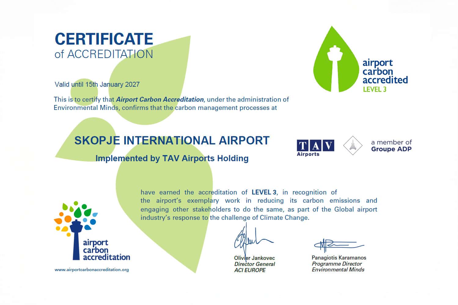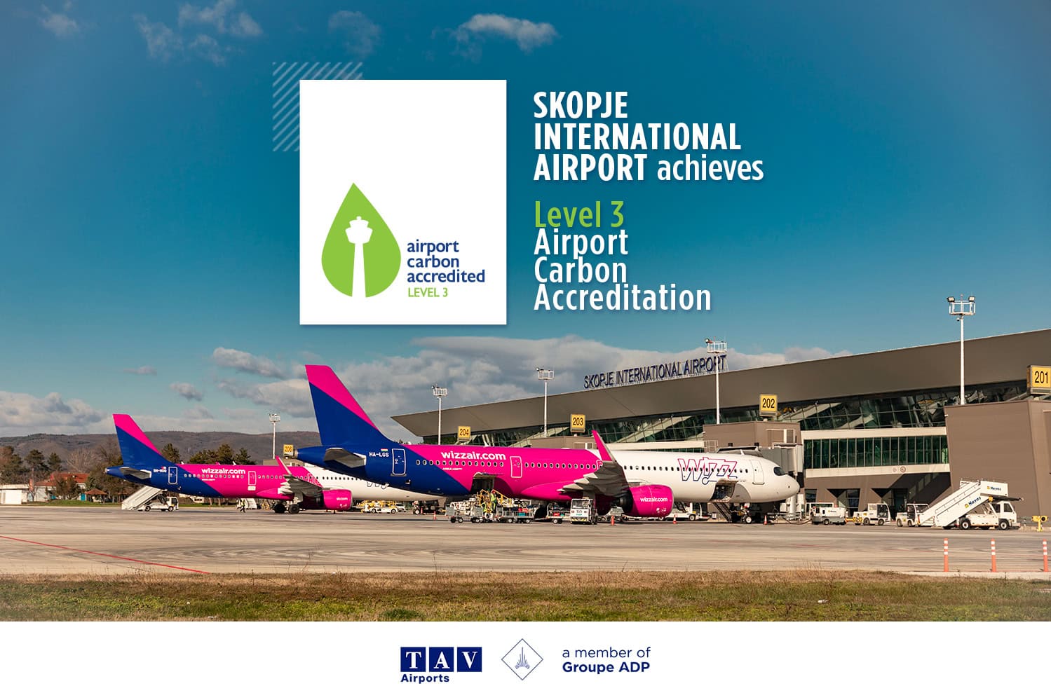 Со постигнување на Ниво 3, Меѓународниот Аеродром Скопје управуван од ТАВ Македонија, подружница на ТАВ Аеродроми и дел од Групацијата АДП не само што го намалува сопствениот јаглероден отпечаток, туку ги вклучува и партнерите и пошироката воздухопловна заедница нао патот кон нето-нулта емисии на јаглерод до 2050 година.