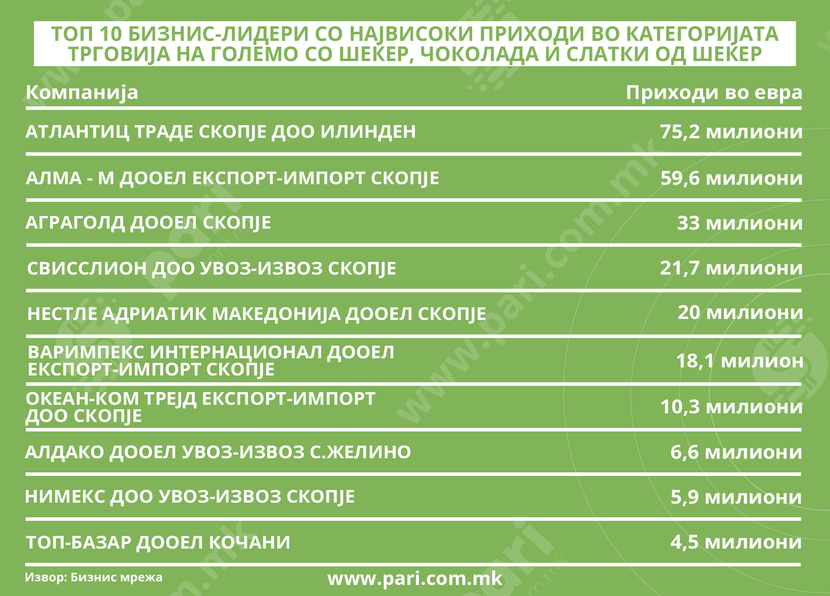 Не е познато колкав е уделот на консументите од Македонија, но мал сигурно не е. Подлогата на ова тврдење е во постигнувањата во рамките на дејноста трговија на големо со шеќер, чоколада и слатки производи, која претставува стабилен и профитабилен сегмент во домашната економија. Порталот Пари, во соработка со Бизнис Мрежа ги анализира бројките што се одраз на нивното успешно работење.