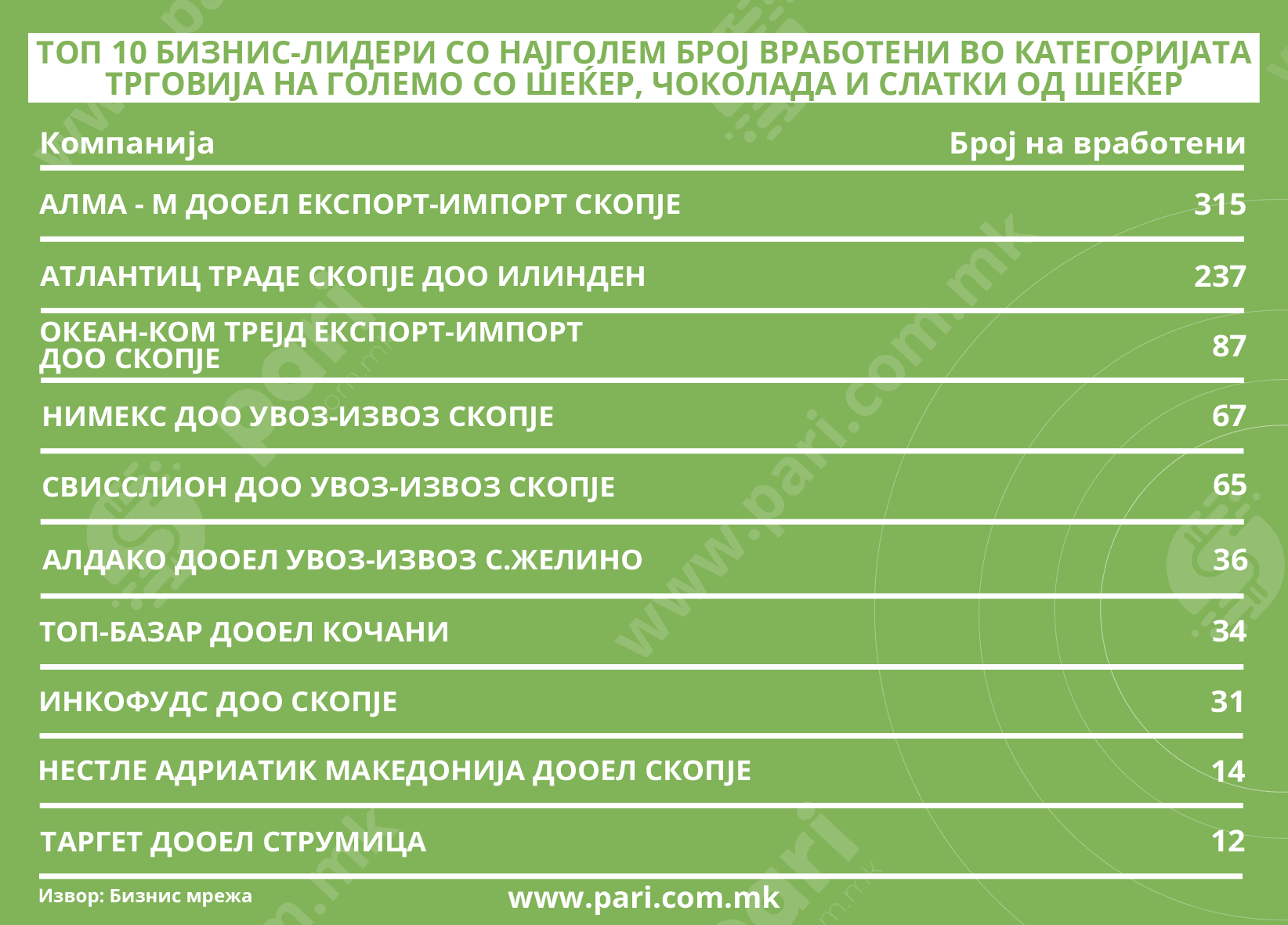 Рангираните десет компании покриваат најголем дел од дистрибуцијата на брендови за слатки и кондиторски производи во Македонија.