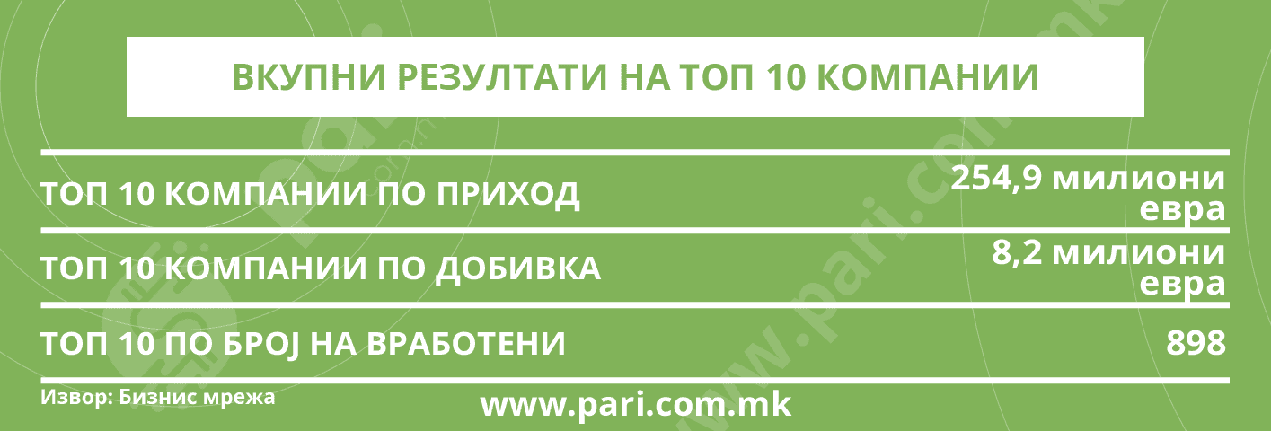 Само една од компаниите не е во составот топ 10 според добивката, а тоа е Топ-Базар од Кочани, ориентиран кон локалната дистрибуција. Нов (само на листатат) е Рикапри од Скопје со 114,1 илјада евра, профит со кој се пласира на деветтото место.