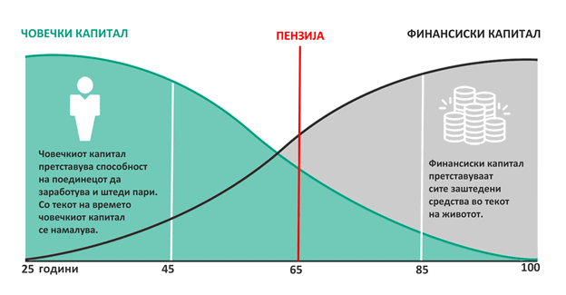 За разлика од човечкиот капитал, финансискиот капитал кај повеќето индивидуи е најнизок на почетокот од работниот век бидејќи на пазарот на труд најчесто влегуваме по завршување на средно училиште или факултет, и неретко, во таа фаза финансискиот капитал е дури негативен поради евентуален долг за финансирање на студиите или потрошувачката во периодот пред вработување. Па така, како одминува времето, намалувањето на човечкиот капитал треба да биде компензирано со соодветно зголемување на финансискиот капитал. Оваа динамика е најдобро објаснета на горниот графички приказ.