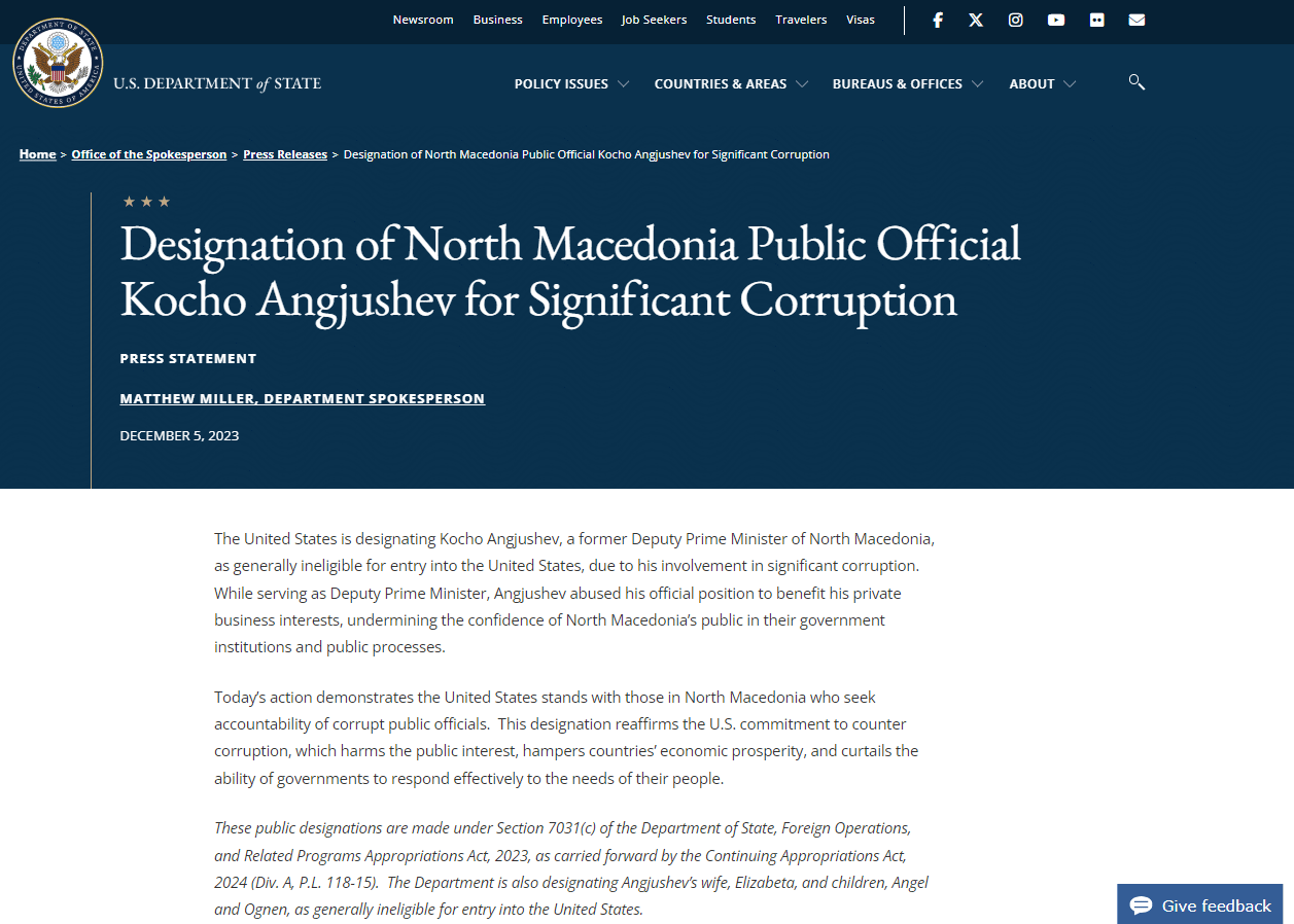 „Соединетите држави го означуваат Кочо Анѓушев, поранешен вицепремиер на Северна Македонија, како генерално неподобен за влез во Соединетите држави поради неговата вмешаност во значителна корупција. Додека ја извршуваше функцијата вицепремиер, Анѓушев ја злоупотреби својата службена положба во корист на неговите приватни деловни интереси и ја поткопа довербата на јавноста во Северна Македонија во владините институции и јавни процеси“. Одлуката на американскиот Стејт департмент беше објавена пред една година и 21 ден.