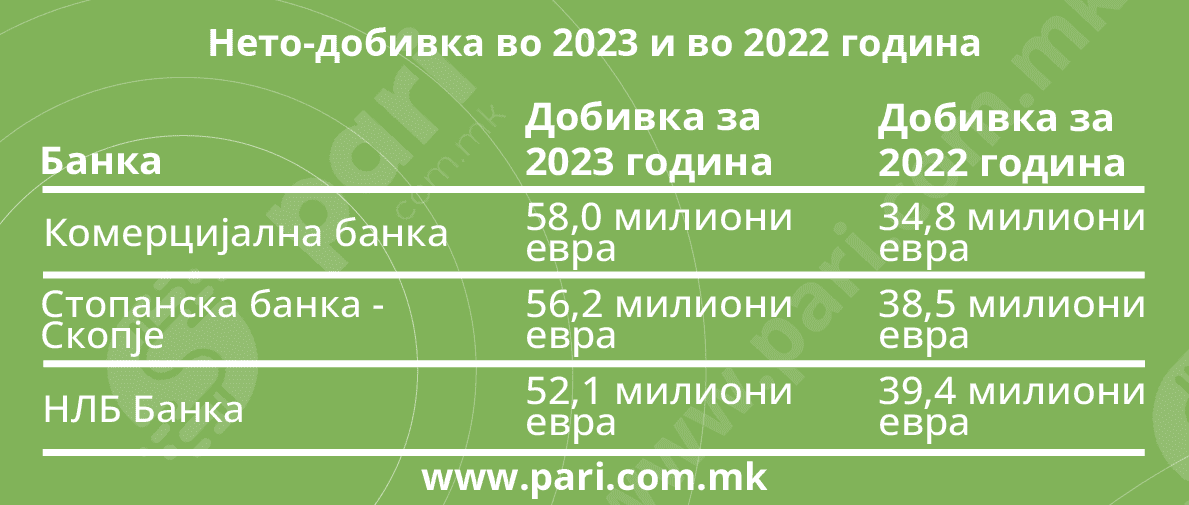 Анализата на „Пари“ покажува вистинско чудо во однос на финансиските резултати на трите најголеми банки (неревидинрани и неконсолидирани извештаи). Вкупната добивка од мината година им била дури 166,3 милиони евра (по срден курс на НБРМ од 61,7 денари за едно евро), додека во 2022 таа изнесувала 112,7 милион евра, или кумулативниот раст изнесува 47,56 %.