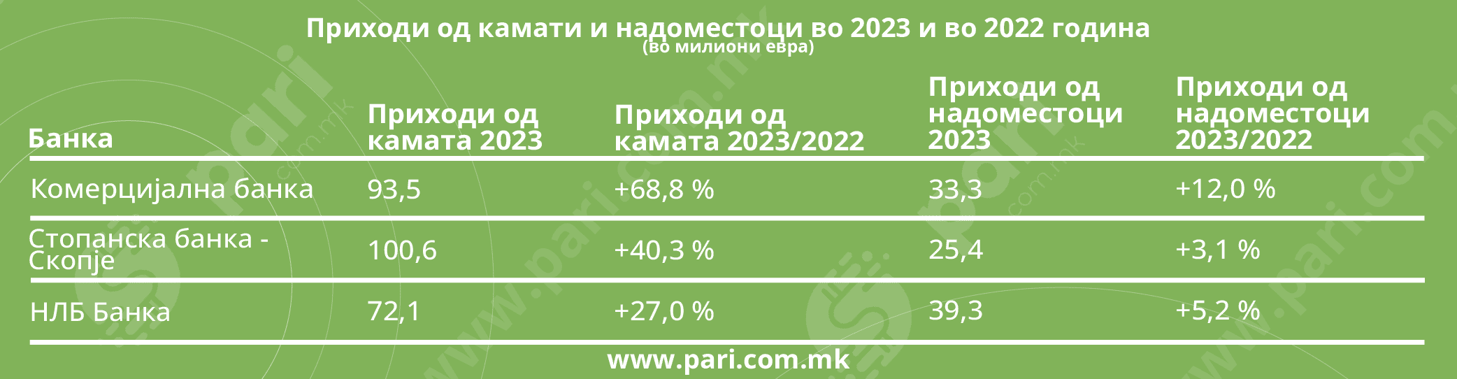 Како што може да се види од податоците од билансите на успех, најголем раст на приходите од камата во 2023 година во однос на 2022 година имала Комерцијална банка, од дури 68,8 проценти, па следи Стопанска банка со раст од 40,3% и НЛБ банка со раст од 27%. Комерцијална банка имала и најголем раст на надоместоци и провизии од 12%, а најмал раст на оваа ставка имало кај Стопанска банка, 3,1%.
