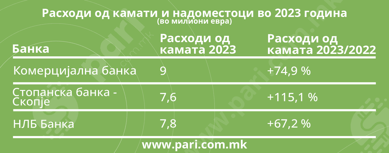 Со растот на основната каматна стапка, по диктатот на Народната банка која ја затегаше монетарната политика, растеа и каматите на кредитите и на депозитите. Оттука, и каматните расходи што ги имале банките биле поголеми. Забележливо е дека кај сите банки растот на расходите од камати е поголем од растот на приходите од камати, а таквиот тренд е најизразен кај Стопанска банка, која прикажала раст на расходи од камата за 115,1%.