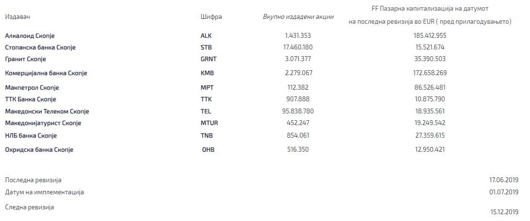 Со последната ревизија која се утврдува два пати годишно на индексот МБИ10 од 17.6.2019, подолу во табелата е неговата моментална структура. Следната ревизија е на 15.12.2019.