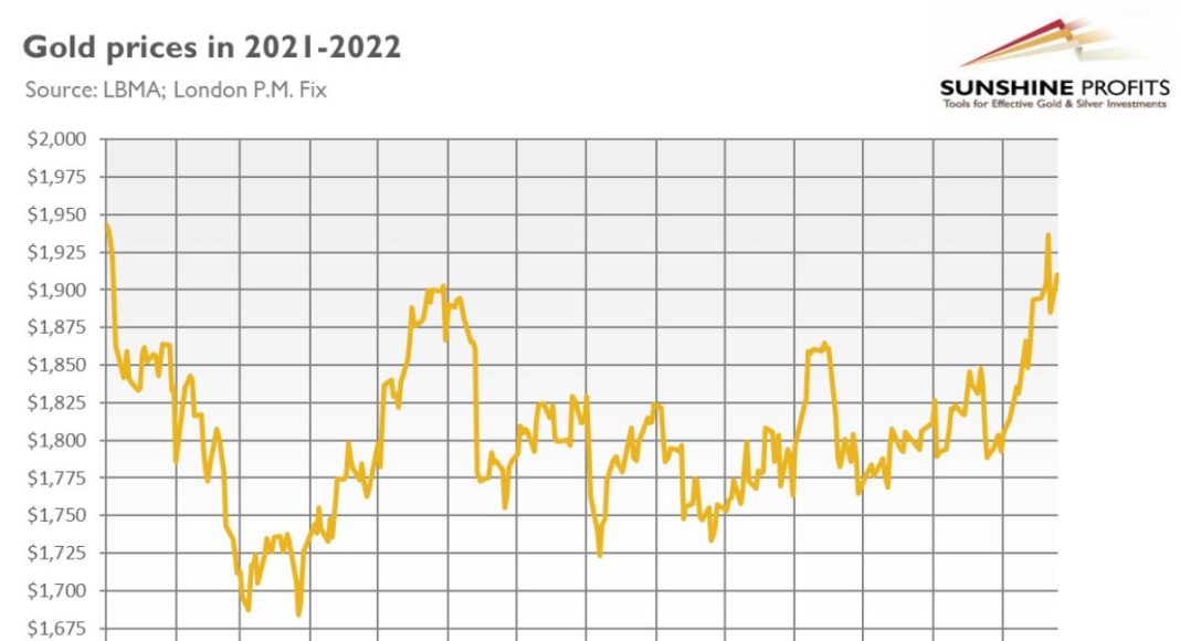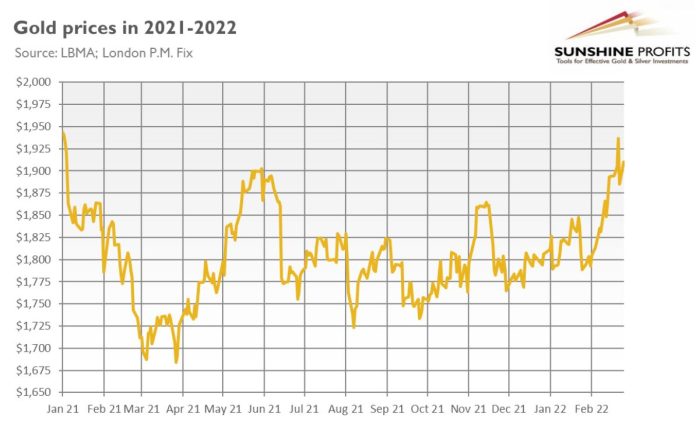 Што значи војната меѓу Русија и Украина за цената на златото? Па, првично, конфликтот беше поддршка на цените на златото. Како што покажува графиконот подолу, цената на златото (London Fix) се искачи на 1.936 долари во четвртокот.