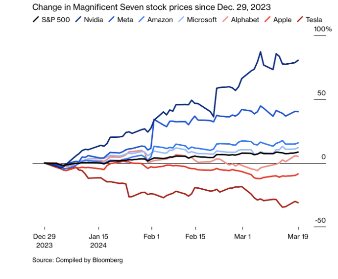 Но, оваа година, Magnificent Seven повеќе личеше на Magnificent Two, Middling Two и Meh Three. Како што инвеститорите почнаа да се фокусираат на важноста на вештачката интелигенција, Nvidia и Meta напредуваа, Мајкрософт и Амазон постигнаа разумно добро, а другите три заостанаа по индексот S&P 500. „Колку и да е добро, ако ја нема таа компонента за вештачка интелигенција, нема да го привлечете вниманието на инвеститорите во моментов“, вели Ким Форест, главен инвестициски директор во Bokeh Capital Partners.