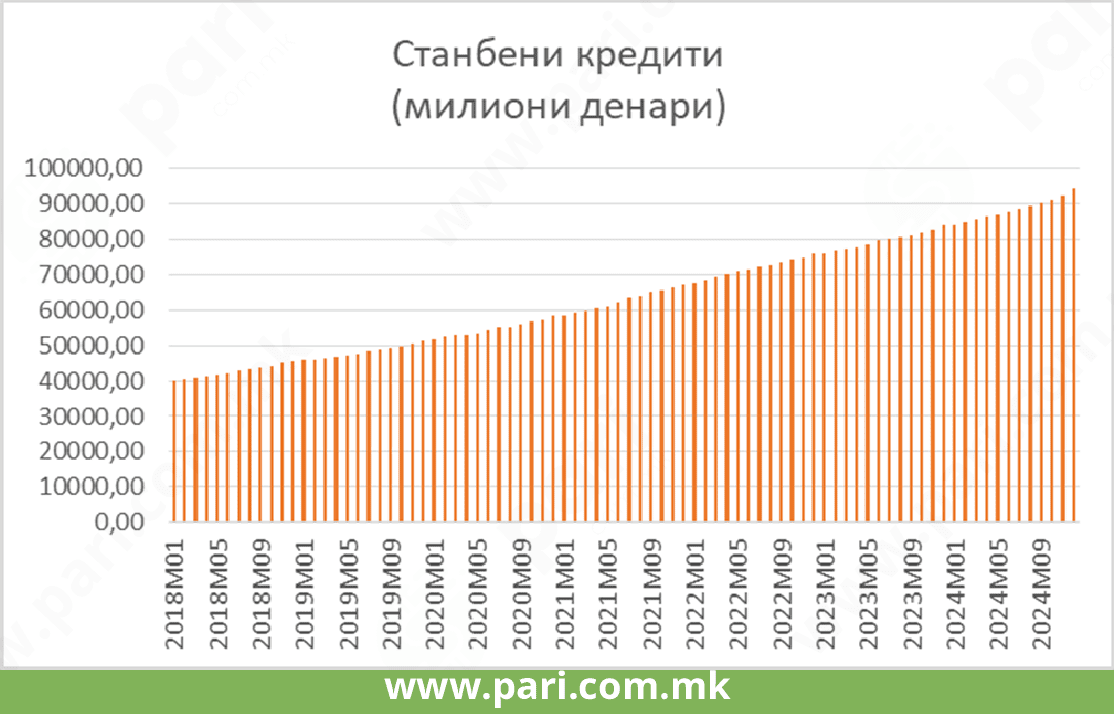 Кај станбените кредити овој раст е уште поизразен. Од декември 2018 година до декември 2021 година вкупниот износ на станбени кредити на граѓаните е зголемен за 21.814 милиони денари (од 45.539 милиони денари на 67.353 милиони денари). Во следните три години, проследени со бум на пазарот на недвижности во земјава, растот на станбените кредити изнесува 27.045 милиони денари (од 67.353 милиони денари на 94.398 милиони денари).