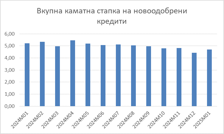 Намалувањето на домашната референтна каматна стапка и надолниот тренд на Еурибор придонесоа и за намалување на каматните стапки во земјава. Во јануари 2025 година просечната каматна стапка на вкупните кредити на месечно ниво беше пониска за 0,09 п.п., а на годишно за 0,34 п.п. и изнесуваше 5,21 насто. Просечната каматна стапка на вкупните кредити на корпоративниот сектор изнесуваше 4,85 насто и забележа месечен пад од 0,11 п.п., а годишен од 0,59 п.п. Каматната стапка на вкупните кредити на домаќинствата изнесуваше 5,55 насто и падна за 0,08 п.п. на месечна основа, а 0,10 п.п. на годишна основа.