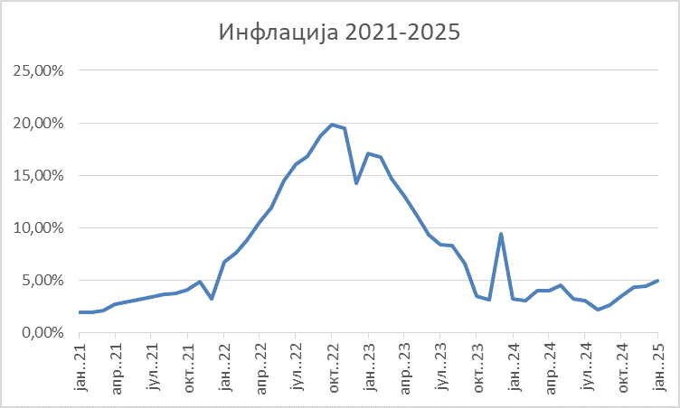 Дали тоа може да значи дека предвидувањата за инфлацијата нема да бидат оптимистички? НБРМ за 2024 година планираше годишна стапка на инфлација од 3,5 насто, додека за 2025 година планот е таа да не биде повисока од 2,5 насто. Според Државниот завод за статистика, инфлацијата мерена преку индексот на трошоците на животот во јануари 2025 година бележи зголемување од дури 4,9 насто во однос на јануари 2024 година, а индексот на цените на мало бележи зголемување од 5,2 насто.