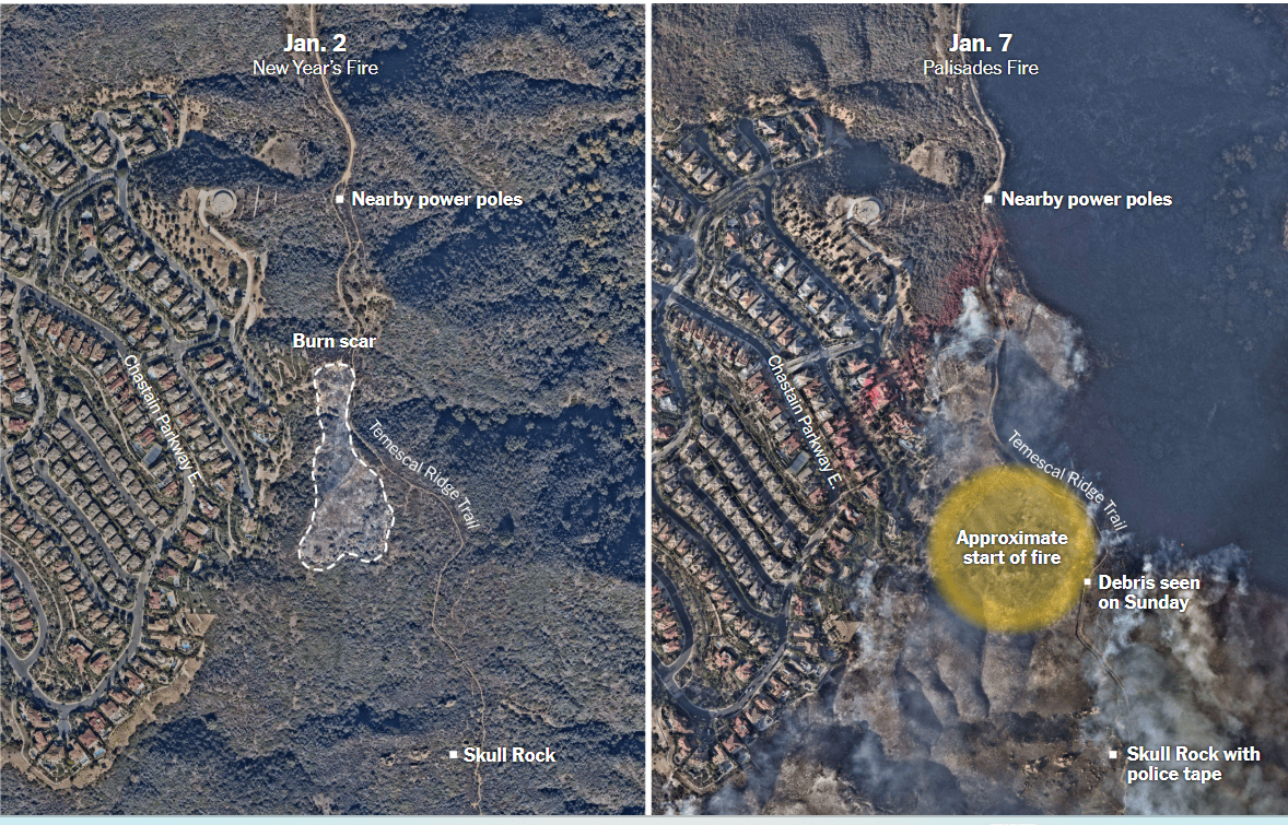 Јагленисаните дрвени бандери за струја се расфрлени на земјата. Едно парче поцрнета почва е местото на претходниот пожар што пожарникарите мислеа дека го изгаснале на Нова година, речиси една недела пред да избие пожарот во Палисадес. И има докази дека ова место имало неодамнешни посетители, кои доаѓаат кај Skull Rock, карпата со морничав облик што ги привлекува планинарите и тинејџерите на забавите чии фрлени шишиња пиво се уште можат да се видат на земјата. Ова е описот на местото каде се претпоставува дека почнал катастрофалниот пожар што ја уништи населбата Пацифик Палисејдс, што е дадена во репортажата на Њујорк Тајмс.