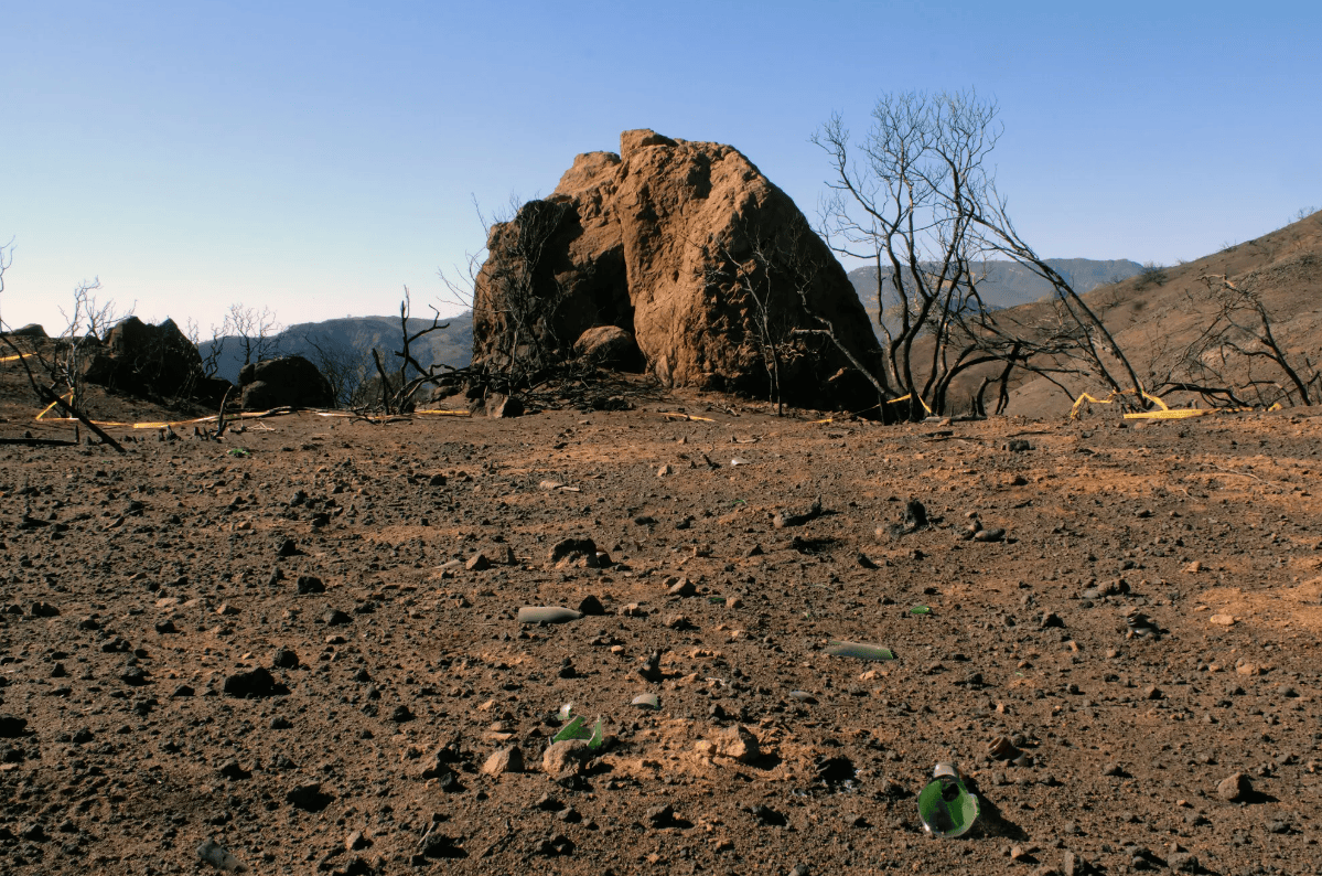 „Сртот високо над Лос Анџелес е исполнет со докази. Има скршени делови од електрична опрема, а шумичка со дрвја поцрнети од пожар. Полициска лента е поставена околу еден дел од песочната почва, сега измешана со пепел“.