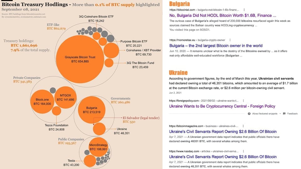 Ако изворот на кинеската влада се смета за легитимен, тогаш луѓето исто така би можеле да претпостават дека Бугарија поседува 213.519 биткоин. Има многу написи во врска со мистеријата зад бугарската влада што ги заплени овие монети, но до денес, сe уште е дискутабилно дали тие сe уште се во сопственост или не на Бугарија.