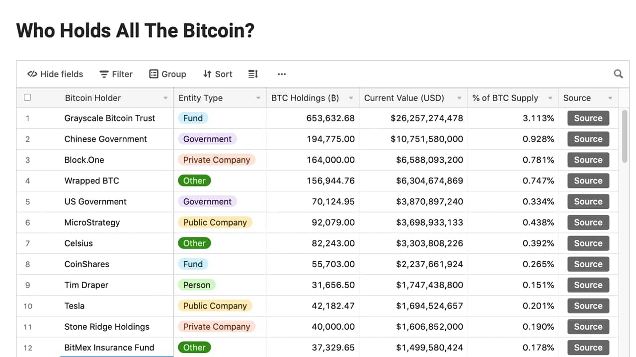 Некои од изворите на листата за тоа кој го поседува целиот биткоин потекнуваат од твитови и други написи поврзани со Тим Дрејпер и Мајкл Сајлор. Освен ако овие лица не докажат сопственост со поместување на споменатите количини на биткоин или не потпишат порака поврзана со приватниот клуч на крипто средството, листата на овие луѓе со приближна сопственост на биткоин е бесмислена.