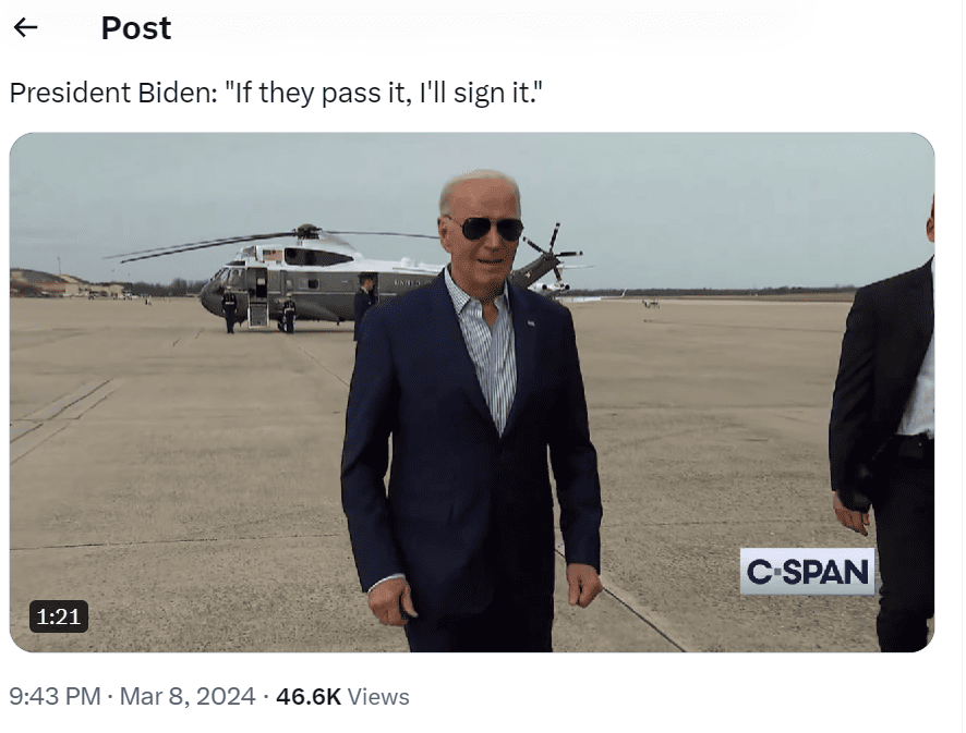 Оваа недела, претседателот Бајден, исто така, експлицитно рече дека ќе го потпише предлог-законот доколку стигне до неговото биро. „Ако го усвојат, ќе го потпишам“, изјави Бајден пред група новинари во петокот.