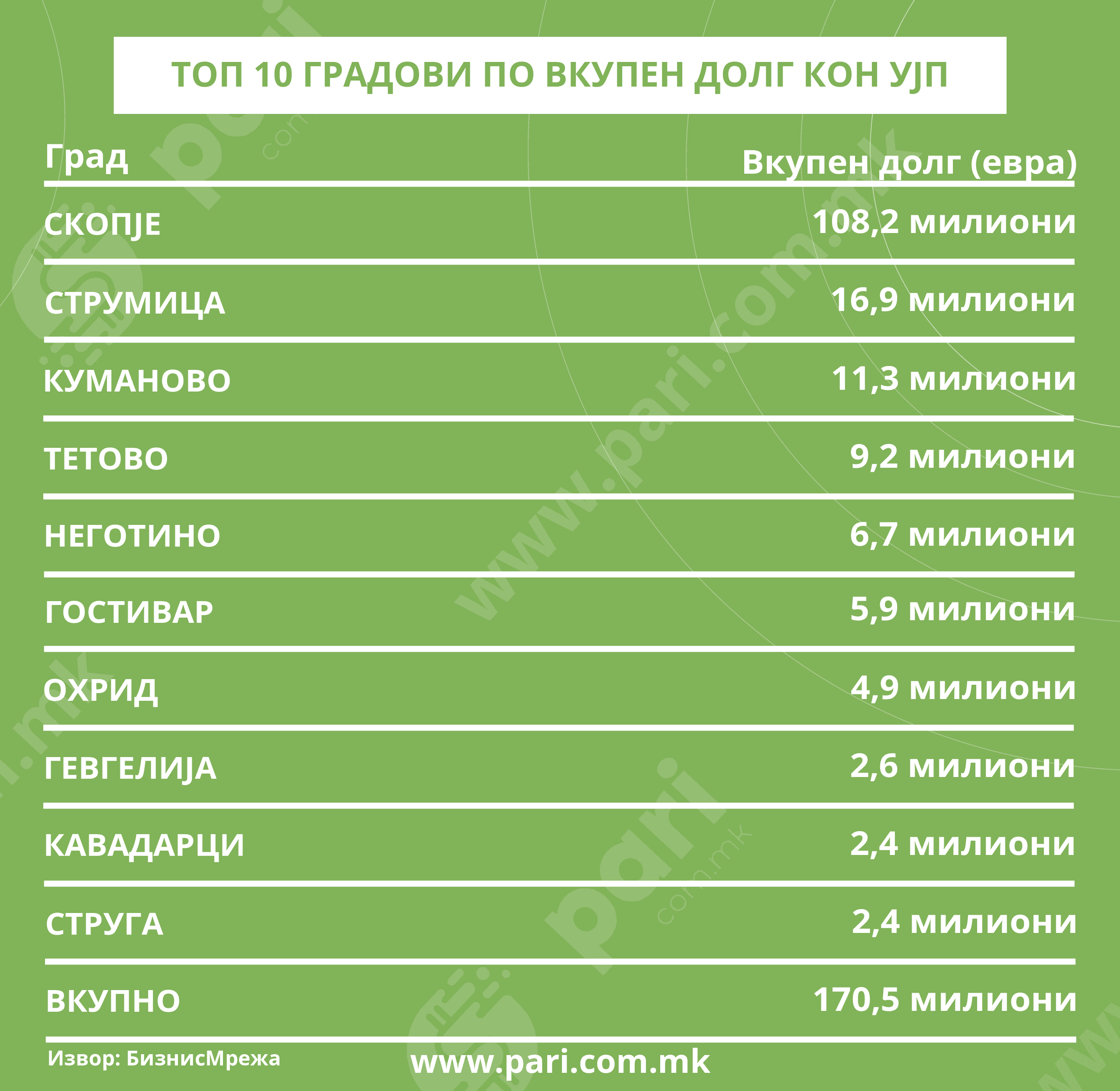 Воедно, само во Скопје долгот е трицифрен. Два града се со долг од над десет милиони евра: Струмица (16,9 милиони евра) и Куманово (11,3 милиони евра). Во првата половина од оваа градска листа се и Тетово, со 9,2 милиони, и Неготино, со 6,7 милиони евра.
