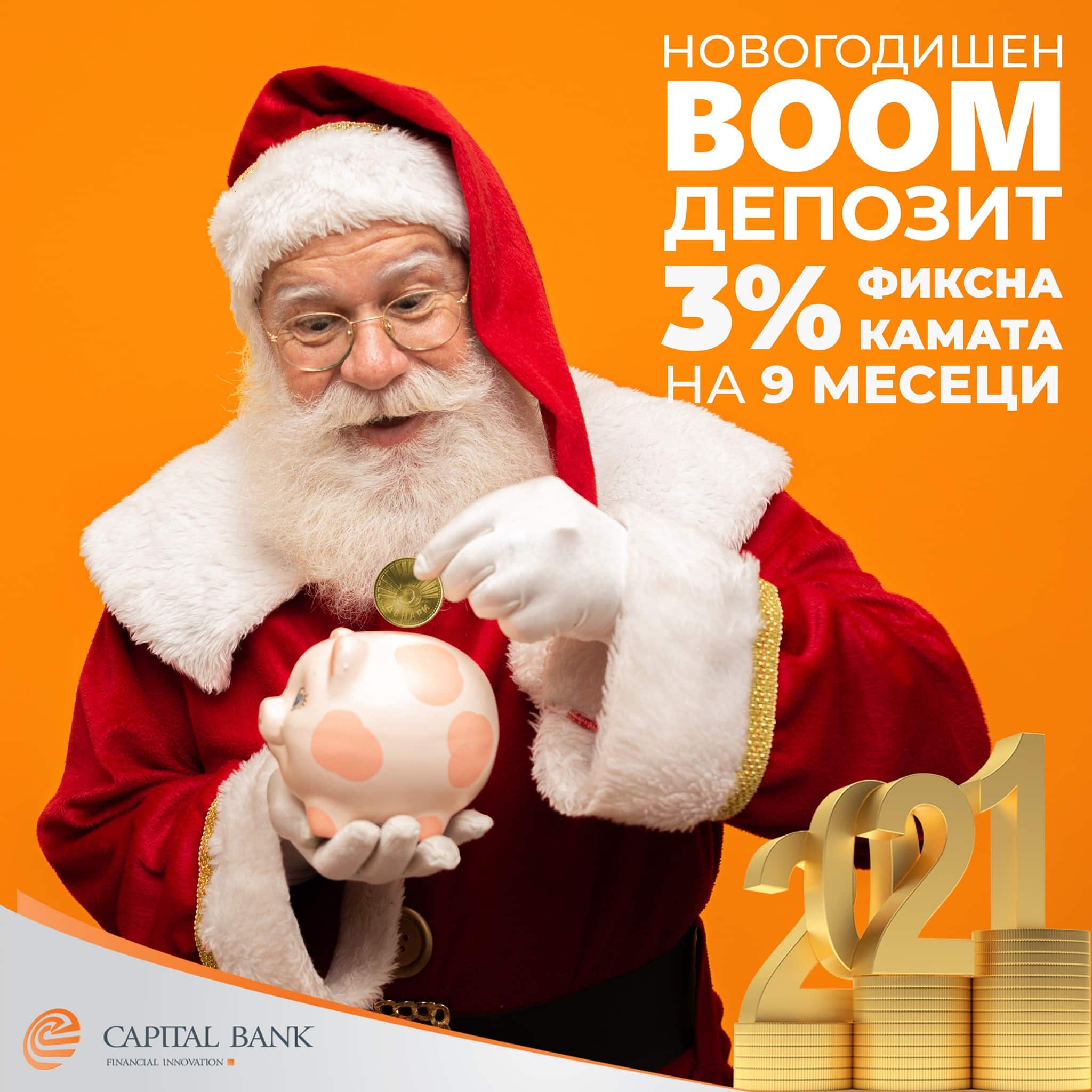 Ви го претставуваме новиот промотивен Новогодишен “BOOM” депозит со 3% фиксна каматна стапка и рок на орочување од 9 месеци на Капитал Банка.