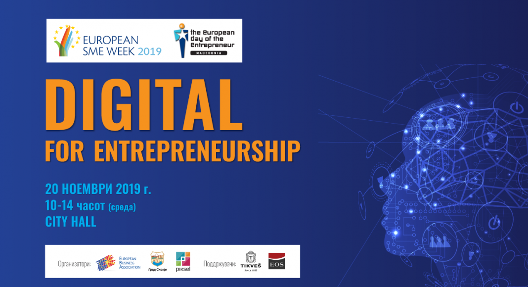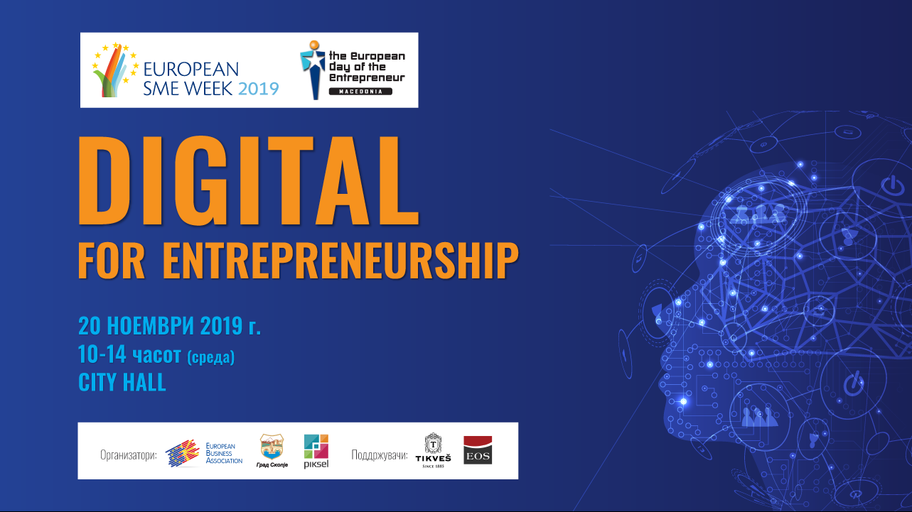 Под наслов “Digital for Entrepreneurship“ во среда, 20.11.2019, 10.00 часот, во City Hall – Скопје, ќе се одржи серија на панели во рамките на „European Day of the Entrepreneur“, а во организација на European Business Association, Град Скопје и Piksel, поддржана од EOS Matrix и Тиквеш, на која ќе се зборува на неколку актуелни теми, со цел олеснување на мисијата и предизвикот со кој претприемачите се соочуваат во денешно време, како и можностите и предизвиците кои што дигитализацијата им ги нуди на малите и средни претпријатија.