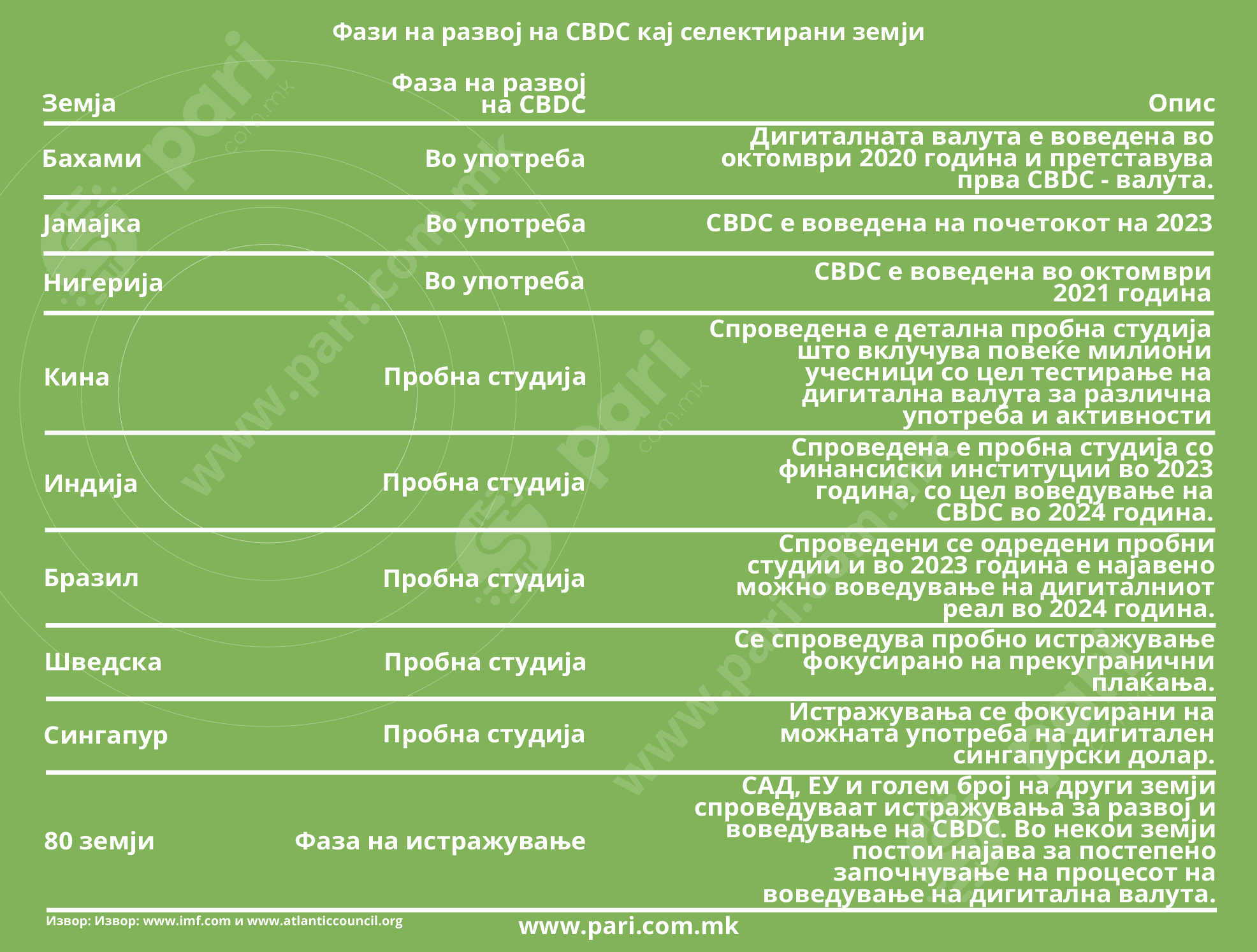Од табелата може да се види дека и покрај тоа што некои земји имаат воведено CBDC, сепак голем дел од земјите или спроведуваат истражувања или воопшто немаат започнато со активности поврзани со дигиталната валута. Останува да се следи развојот поврзан со CBDC и искуството на земјите каде што е воведена дигитална валута или се спроведуваат пробни студии.