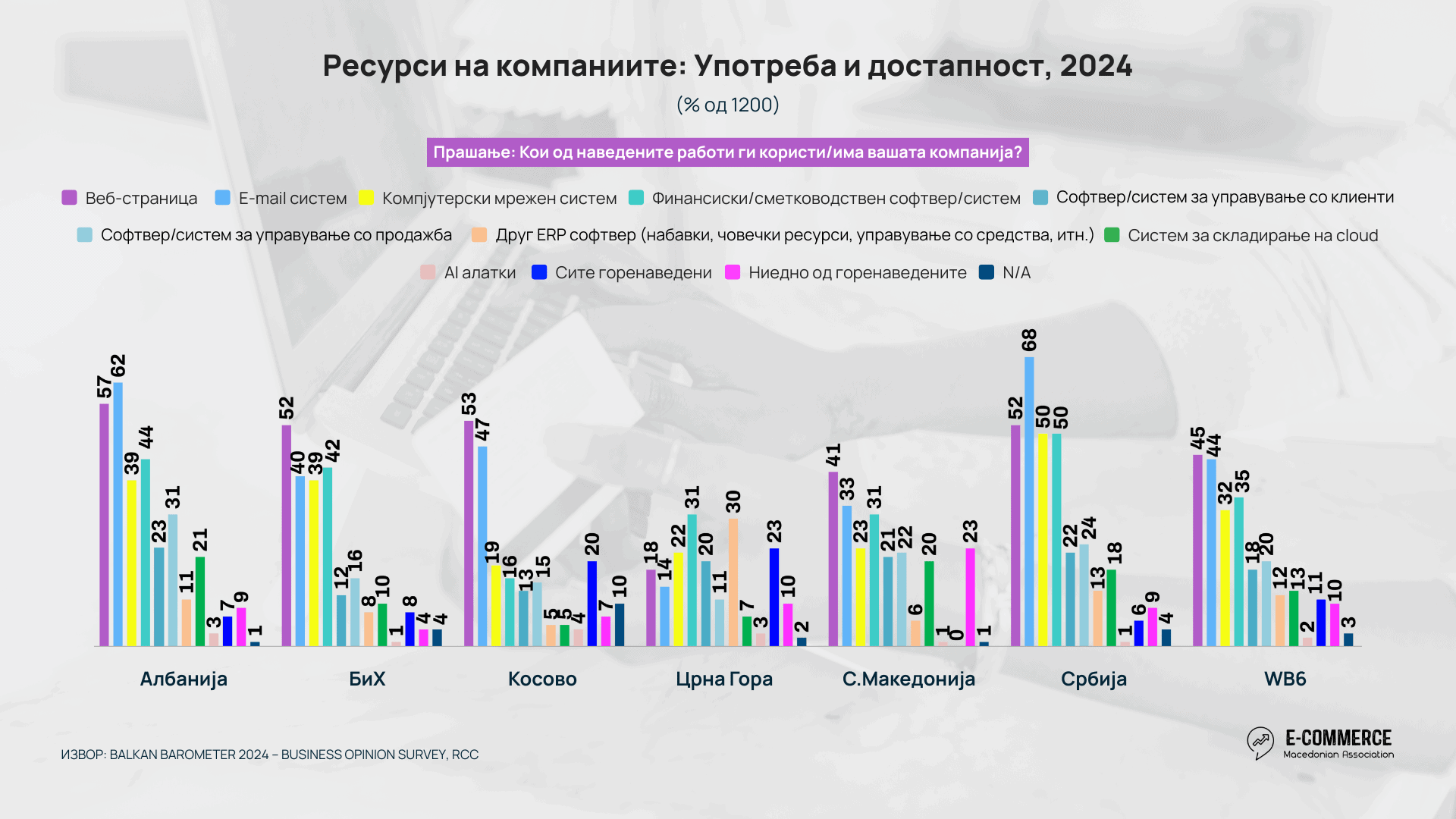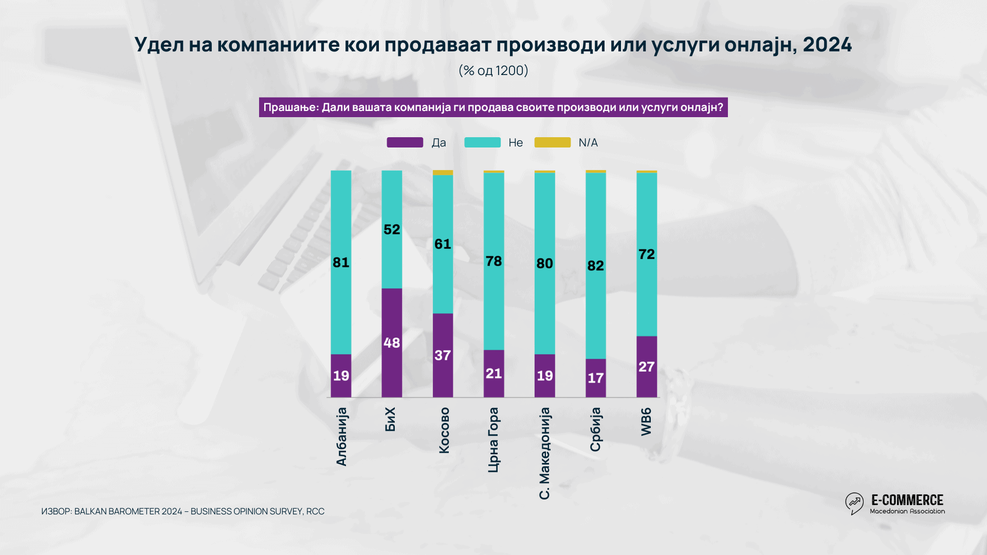 Во Прегледот на Е-трговијата во Западен Балкан, 2025 година изработен од Асоцијацијата за е-трговија, анализирани се податоците од анкетата  во Бизнис барометарот за Западен Балкан 2024, спроведен од Регионалниот совет за соработка (RCC), која  обезбедува редовен увид во состојбата, очекувањата и дигиталната подготвеност на компаниите во регионот. Истражувањето опфаќа 1.200 компании од Западен Балкан, по 200 од секоја економија, и прашалникот ги адресира клучните аспекти на деловното работење – вклучувајќи иновации, технологија и користење на е-трговијата.