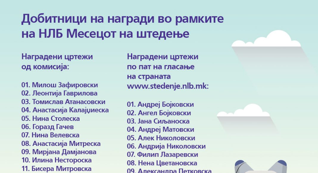 На крајот на Месецот на штедење беа наградени вкупно 30 цртежи, од кои 20 од страна на комисија од реномирани македонски уметници: Сергеј Андреевски, Филип Фидановски и Мирослава Микица Трујкановиќ и 10 по пат на гласање на веб страницата www.stedenje.nlb.mk