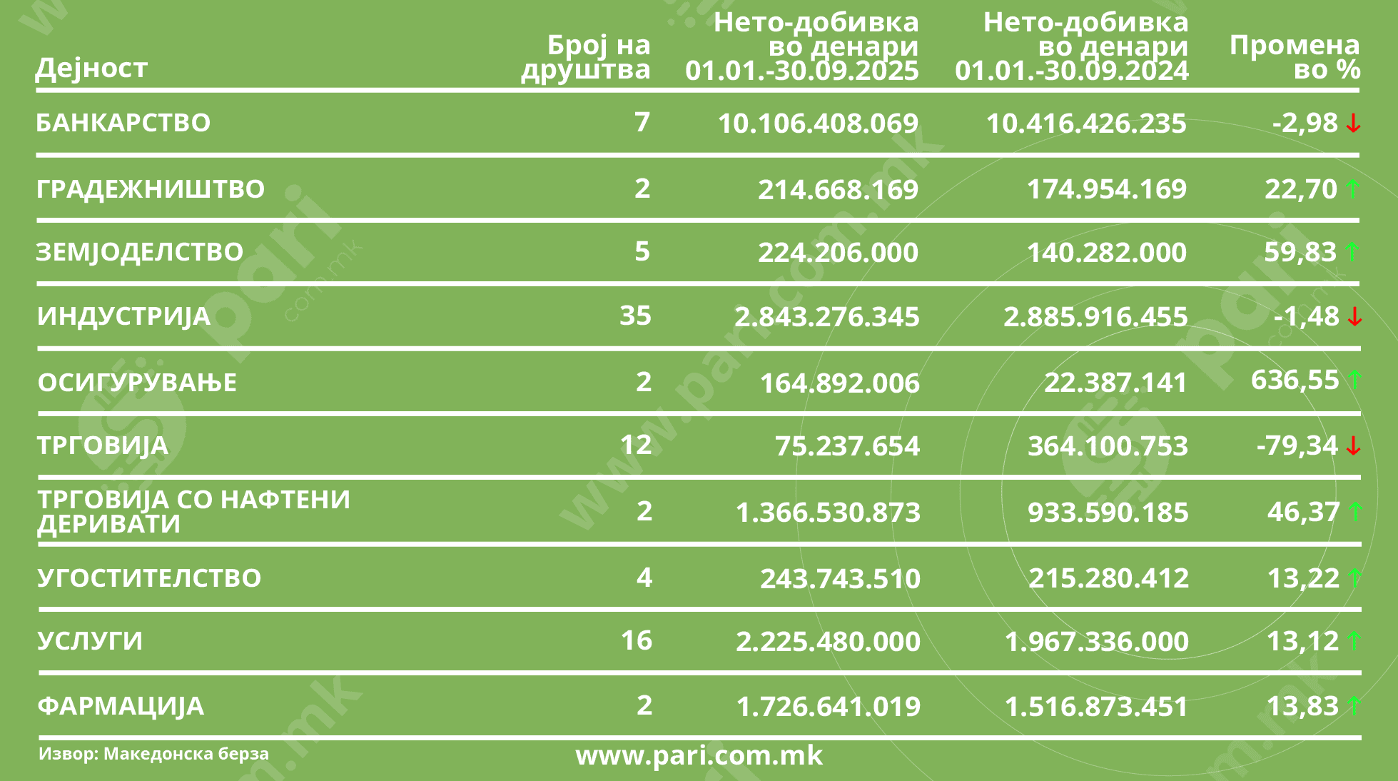 Од десетте дејности, седум бележат зголемување, а три намалување на добивката. Најголем по обем и понатаму е банкарскиот сектор, кој создава повеќе од половина од вкупниот профит (164,3 милиони евра), и покрај тоа што годинава е проследен со пад од речиси три отсто.