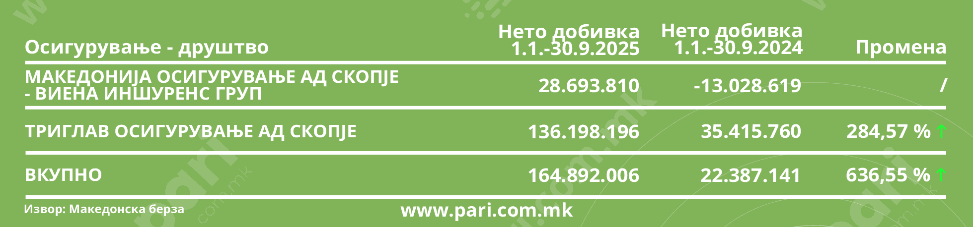 Осигурување – Од минатогодишните 364 илјади евра, добивката на Македонија осигурување – Виена иншуренс груп и на Триглав осигурување се мултиплицирала на скоро 2,7 милиони евра. Тој исчекор се мери со плус 636,55 насто.