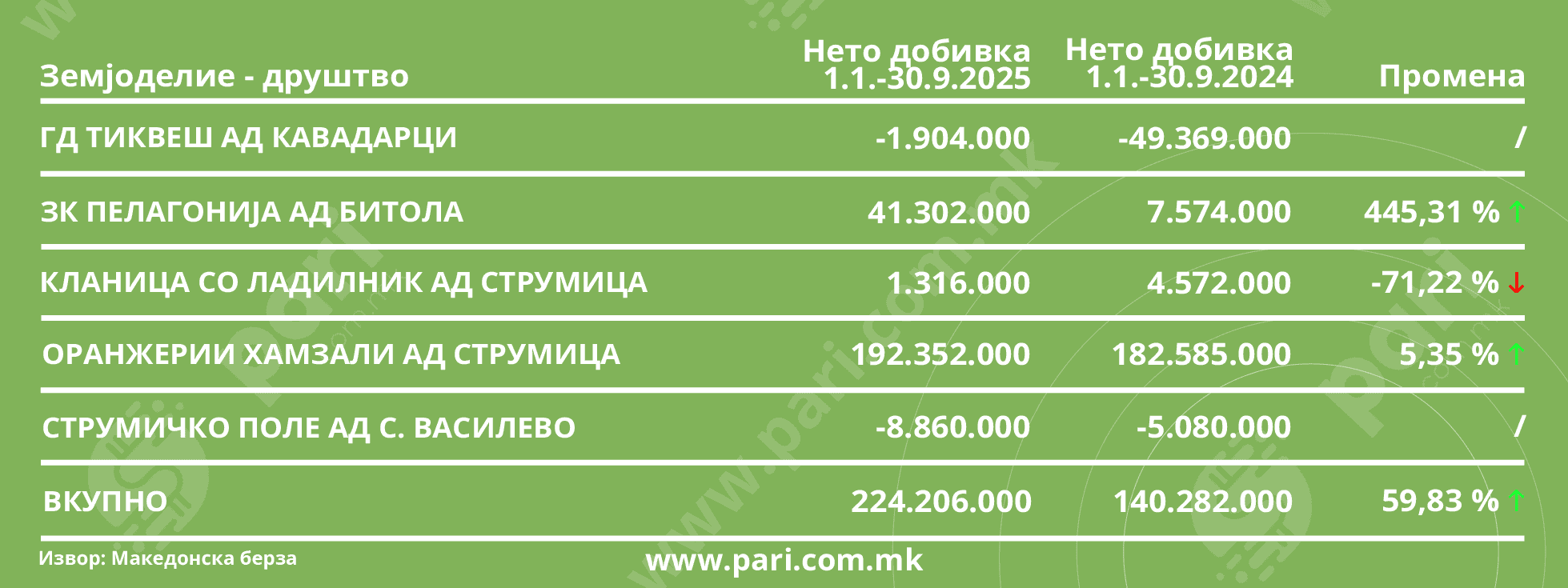 Вкупната добивка на компаниите котирани на Македонска берза за одработените девет месеци од годинава изнесува 19,19 милијарди денари или приближно 311,9 милиони евра, што е за 2,98 насто повеќе во однос на истиот лански период. Во тоа заедничко постигнување профитот има удел од 19,82 милијарди денари, проследен со раст од 2,46 насто, додека загубите се  намалени на 630,4 милиони денари, за разлика од регистрираните во 2024 година – 709,3 милиони денари.