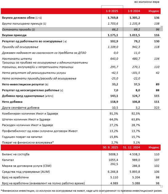 Вкупниот деловен обем, во висина од 194,9 милиони евра, се зголеми за 7%, исто колку што порасна и премијата во животните осигурувања. Премијата се зголеми на сите пазари на групацијата. Нејзиниот раст беше висок, поради дополнителните уплати во инвестициски животни осигурувања.