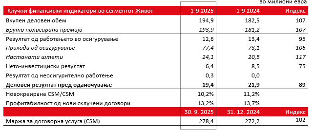 Деловниот резултат пред оданочување во сегментот Живот достигна 19,4 милиони евра, додека минатата година изнесуваше 21,9 милиони евра. Споредбата меѓу резултатите од двете години треба да го земе во предвид овогодинешното унапредување на методологијата за ануитетско осигурување, кое, меѓу другото, ја подобрува проекцијата на парични текови за овие осигурувања на попретпазлив начин.