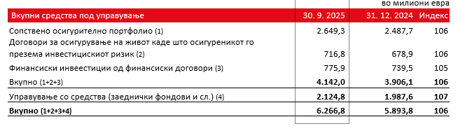 Вкупните средства под управување на Групација Триглав изнесуваа 6,3 милијарди евра на крајот на септември 2025-та година, што претставува зголемување од 6% во однос на крајот на 2024-та година.