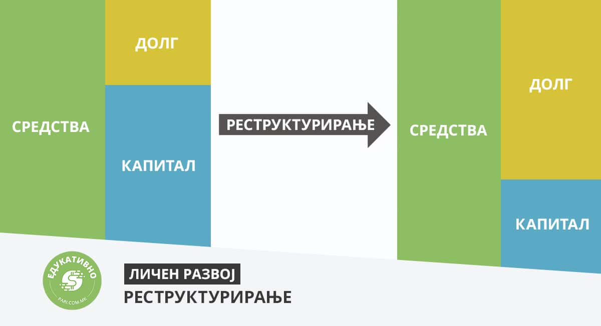 Реструктуирање на долгот може да вклучува рефинансирање на постојните кредитни обврски, со цел да се намали каматната стапка или да се продолжи периодот на отплата со цел да се олеснат финансиските оптоварувања. Преструктуирање на капиталот компаниите прават преку издавање дополнителни акции или откуп на постојни акции за да ја променат сопственичката структура или да ја прилагодат контролата на компанијата. Финансиско преструктурирање се врши со докапитализација, која може да се искористи за да се подобри финансиската состојба и стабилноста на компанијата преку зајакнување на нејзиниот биланс. Ова може да вклучува намалување на нивото на долг, зголемување на капиталот, или и двете.